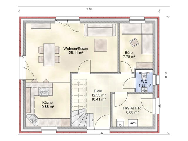 Vorzugsweise empfiehlt sich generell eine offene, alltagstaugliche und funktionale Raumgestaltung wie bei einem kombinierten Küchen-, Wohn- und Essbereich sowie eine Reduktion nicht voll nutzbarer Flächen wie beispielsweise Fluren oder Nischen. Denn so können Sie die Wohnfläche beim Grundriss Ihres Einfamilienhauses effizient gestalten und gleichzeitig Kosten sparen – genau wie durch durchdachtes Verlegen von Leitungen, wie etwa mit direkt übereinander liegenden Bädern in verschiedenen Etagen.