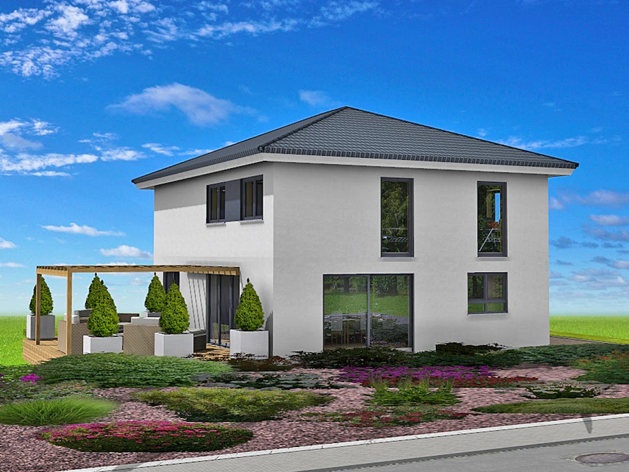 Für dieses Haus mit einer Grundfläche von etwa 108 m² empfehlen wir ein Grundstück ab circa 450 m². Wir haben dabei rund 50 m² für Stellplätze und eine großzügige Gartenfläche von etwa 315 m² eingerechnet. So bleibt genügend Platz für Abstandsflächen und Ihre private Grünanlage, damit die Stadtvilla auf Ihrem neuen Grundstück ideal zur Geltung kommt.