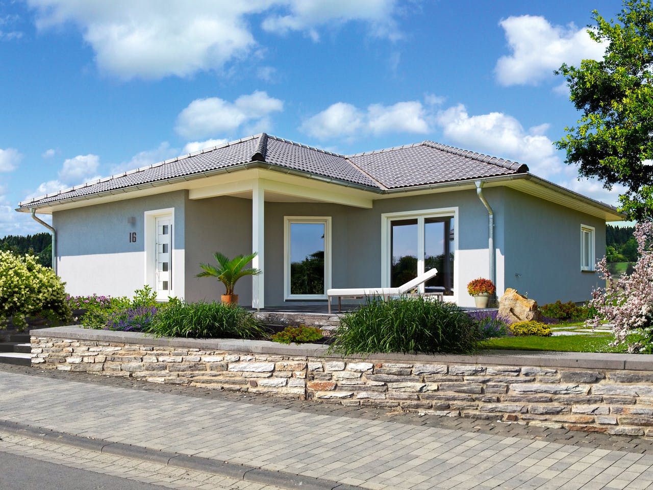 Das Walmdach mit einer Neigung von 22 Grad verleiht dem Bungalow Mala eine elegante, klassische Optik. Diese Dachform bietet exzellenten Schutz für die Fassade und betont den luxuriösen Charakter des ebenerdigen Wohnens. Wir finden, dass dieser Stil perfekt zur modernen Architektur passt und gleichzeitig eine zeitlose Beständigkeit vermittelt, die sich harmonisch in verschiedene Wohngebiete einfügt.