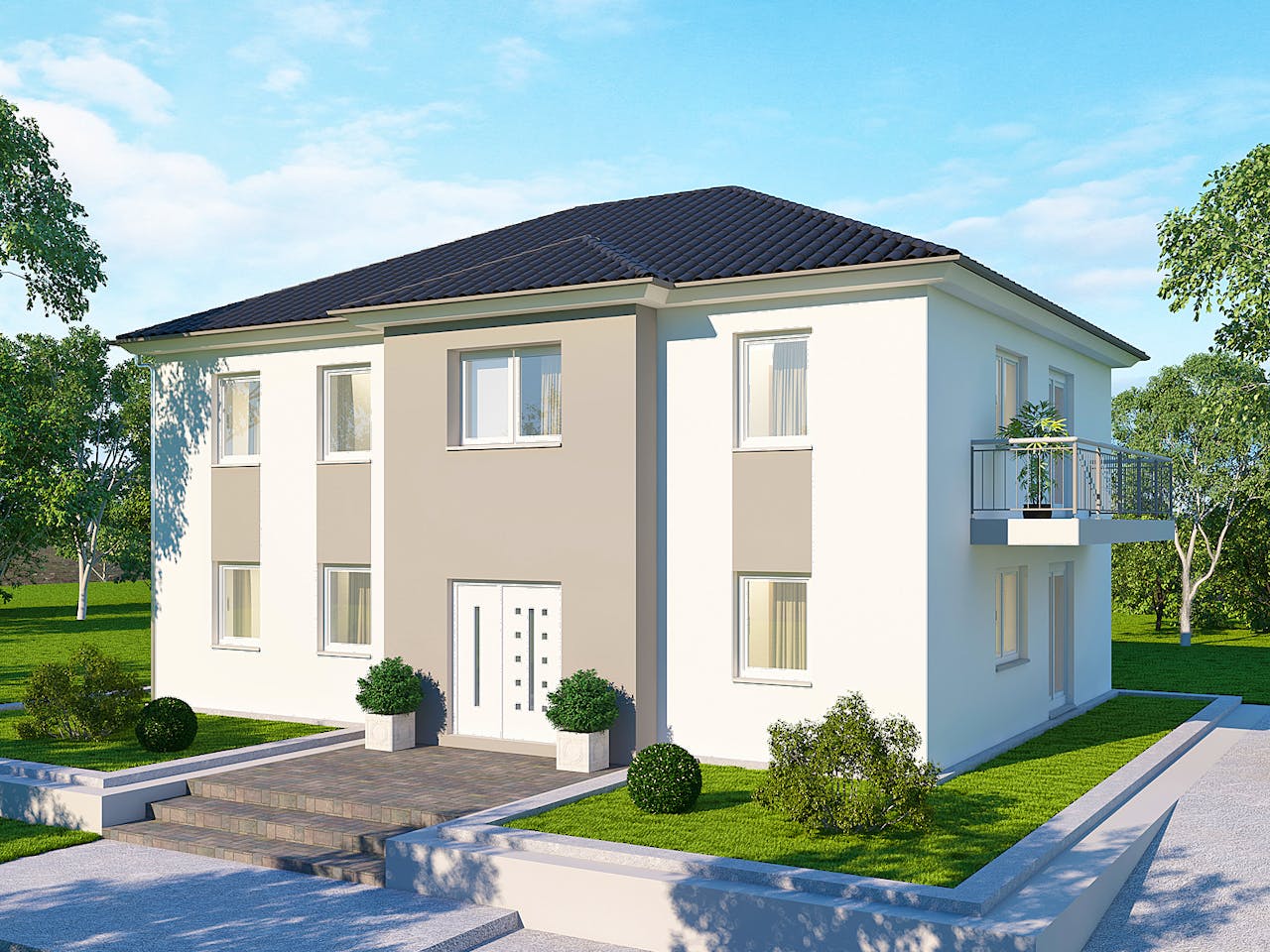 Dieses Modell besticht durch ein klassisches Zeltdach und ein separates Treppenhaus. Dies ermöglicht eine strikte Trennung der zwei Wohneinheiten, wodurch die Privatsphäre beider Parteien gewahrt bleibt. Mit jeweils drei Zimmern auf rund 93 Quadratmetern pro Etage bietet das Haus eine harmonische Aufteilung. Die massive Bauweise sorgt zudem für einen ausgezeichneten Schallschutz zwischen den Wohnungen.
