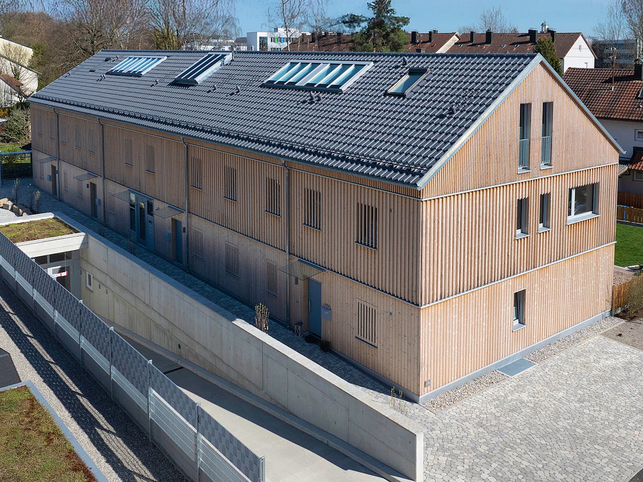 - die Fenster neben den Haustüren sind mit einem Sichtschutz versehen, indem die senkrechten Latten der Holzschalung gestreiftüber die Fensteröffnungeb weiter laufen