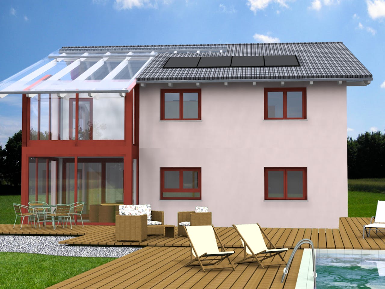 Dieses Haus nutzt das patentierte Haus-im-Haus-Prinzip von Bio-Solar-Haus. Das gedämmte Innenhaus wird von einer schützenden Außenhülle umschlossen. Ein integrierter Wintergarten und transparente Dachflächen nutzen die Sonnenenergie zur Erwärmung der Luftschicht dazwischen. Dieses klassische Satteldachhaus benötigt daher keine mechanische Lüftungsanlage und bietet ein einzigartiges, wohngesundes Klima ohne Schimmelgefahr oder unangenehme Zugluft.