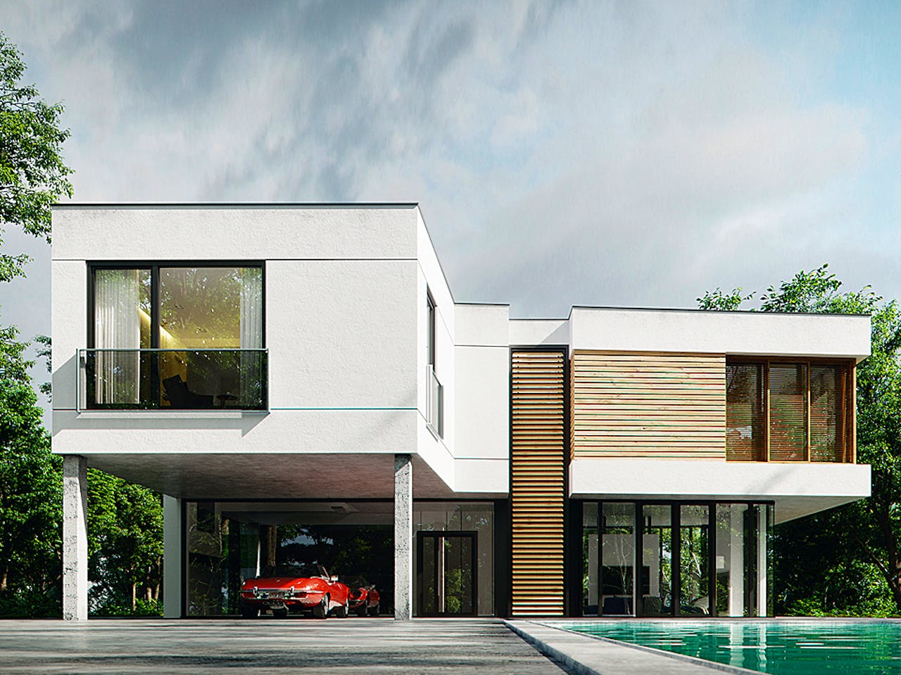 Das Haus ist als modernes Cubushaus im Bauhaus-Stil entworfen. Besonders markant ist das optisch schwebende Obergeschoss, das durch eine Kombination aus Holzständerwerk und Stahlträgern ermöglicht wird. Die Fassade kombiniert großflächige Verglasungen mit warmen Holzverkleidungen und Schiebeläden. Dieser Mix sorgt für eine zeitlose Ästhetik, die sich harmonisch in eine naturnahe Umgebung am Hang einfügt.