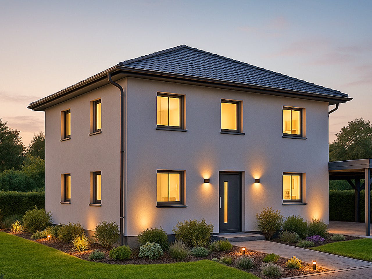 Die Stadtvilla besticht durch ihre klassische Architektur mit einem eleganten Walmdach. Dank der zwei vollen Etagen ohne störende Dachschrägen können Sie die gesamte Wohnfläche im Obergeschoss uneingeschränkt für Ihre Einrichtung nutzen. Die Fassade lässt sich zudem individuell gestalten. Über uns können Sie weitere Details zur Ausstattung, wie etwa bodengleiche Duschen oder elektrische Rollläden, für Ihre Planung anfragen.