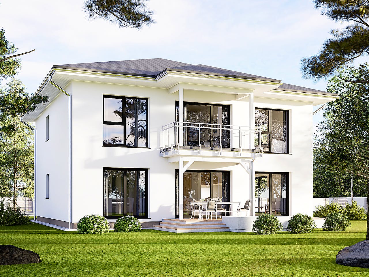 Die Architektur dieser Stadtvilla wird durch ein klassisches Walmdach mit 22 Grad Neigung geprägt. Der Entwurf sieht zwei separate Wohneinheiten vor, die über eine gemeinsame Diele im Erdgeschoss erschlossen werden. Dieser Aufbau garantiert beiden Parteien ausreichend Privatsphäre unter einem Dach. Das Haus eignet sich hervorragend für Mehrgenerationenprojekte oder als Kombination aus Eigennutzung und Vermietung in städtischen Lagen.