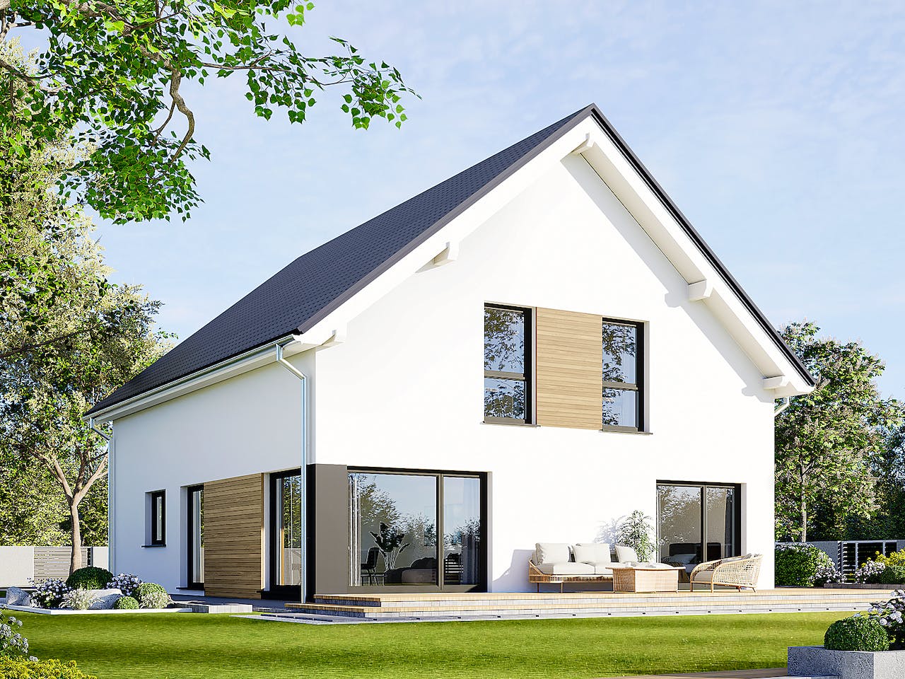 Das klassische Satteldach überzeugt mit einer Neigung von 40 Grad und einem Kniestock von 1,25 Metern. Diese Bauweise schafft im Obergeschoss wertvollen Wohnraum mit angenehmer Stehhöhe. Die zeitlose Architektur verbindet Funktionalität mit einem ansprechenden Design, das sich harmonisch in viele Wohngebiete einfügt. Wir beraten Sie gern zu weiteren gestalterischen Möglichkeiten.