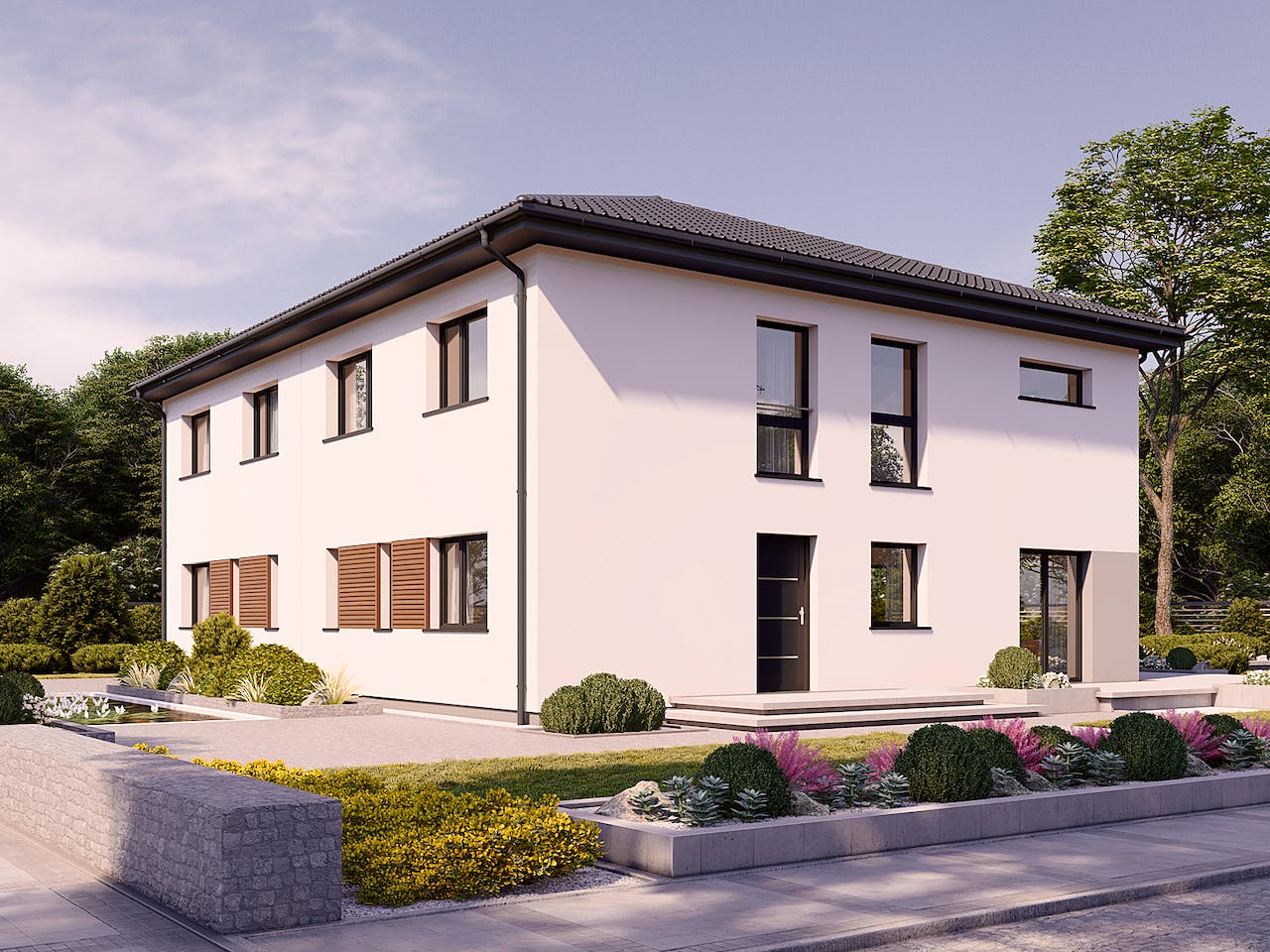 Die Partner 142W ist als klassische Stadtvilla konzipiert und besticht durch zwei vollwertige Geschosse ohne störende Dachschrägen. Das elegante Walmdach mit einer Neigung von 22 Grad verleiht dem Gebäude eine zeitlose Optik. Durch die Holzrahmenbauweise und den Standard Effizienzhaus 40 bietet die Architektur eine gelungene Kombination aus moderner Ästhetik und hoher Energieeffizienz.