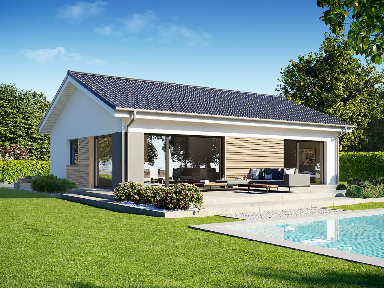 Das Perfect 86 besticht durch seine großen Fensterflächen, die für eine helle und weite Wohnatmosphäre sorgen. Der klassische Satteldach-Stil verleiht dem Bungalow ein zeitloses Äußeres. Besonders hervorzuheben ist die effiziente Raumaufteilung, die trotz der kompakten Wohnfläche eine klare Trennung zwischen dem großzügigen Wohn-Essbereich und den privaten Schlafräumen ermöglicht.