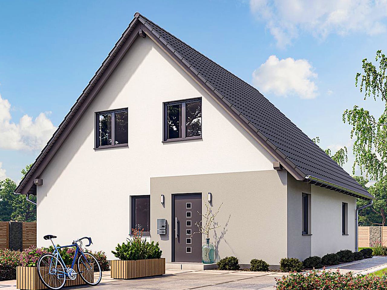 Das Haus besticht durch sein klassisches Satteldach mit einer Neigung von 45 Grad. Diese Bauweise schafft auf 1,5 Etagen eine gemütliche Wohnatmosphäre mit insgesamt fünf Zimmern. Dank der kompakten Außenmaße von etwa 9,44 mal 9,44 Metern eignet sich die Architektur hervorragend für kleinere Grundstücke, ohne dass Sie im Inneren auf ein großzügiges Raumgefühl verzichten müssen.