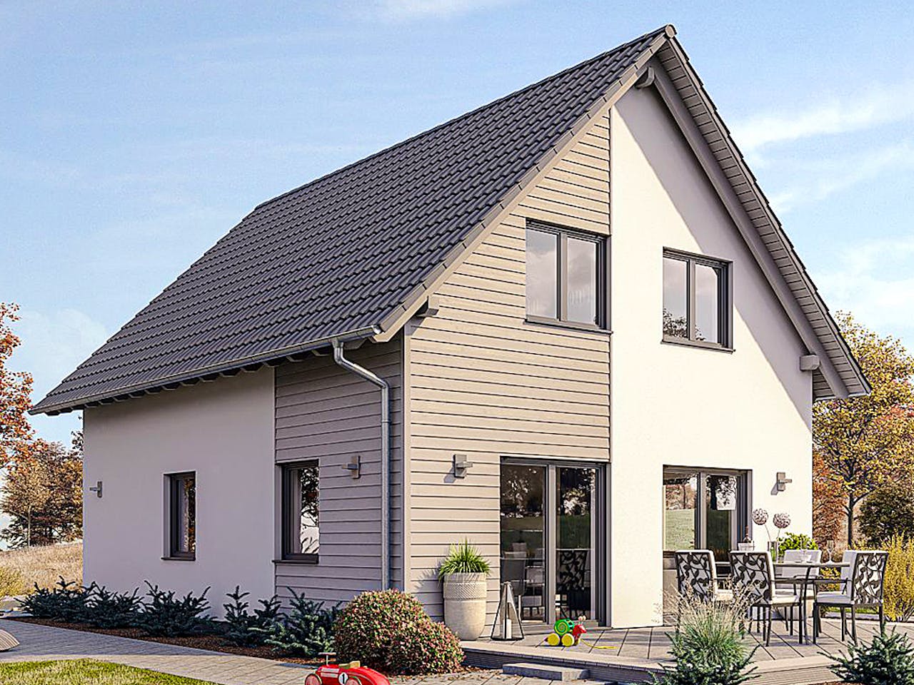 Dieses Einfamilienhaus überzeugt als klassischer Satteldach-Klassiker mit einer Dachneigung von 45 Grad. Die kompakte Bauweise auf anderthalb Etagen nutzt die Grundfläche optimal aus und bietet Platz für vier Zimmer. Dank des massiven Fertighaus-Systems von EBH Haus profitieren Sie zudem von einer hervorragenden Wärmedämmung, die den strengen Anforderungen eines Effizienzhauses 40 entspricht.