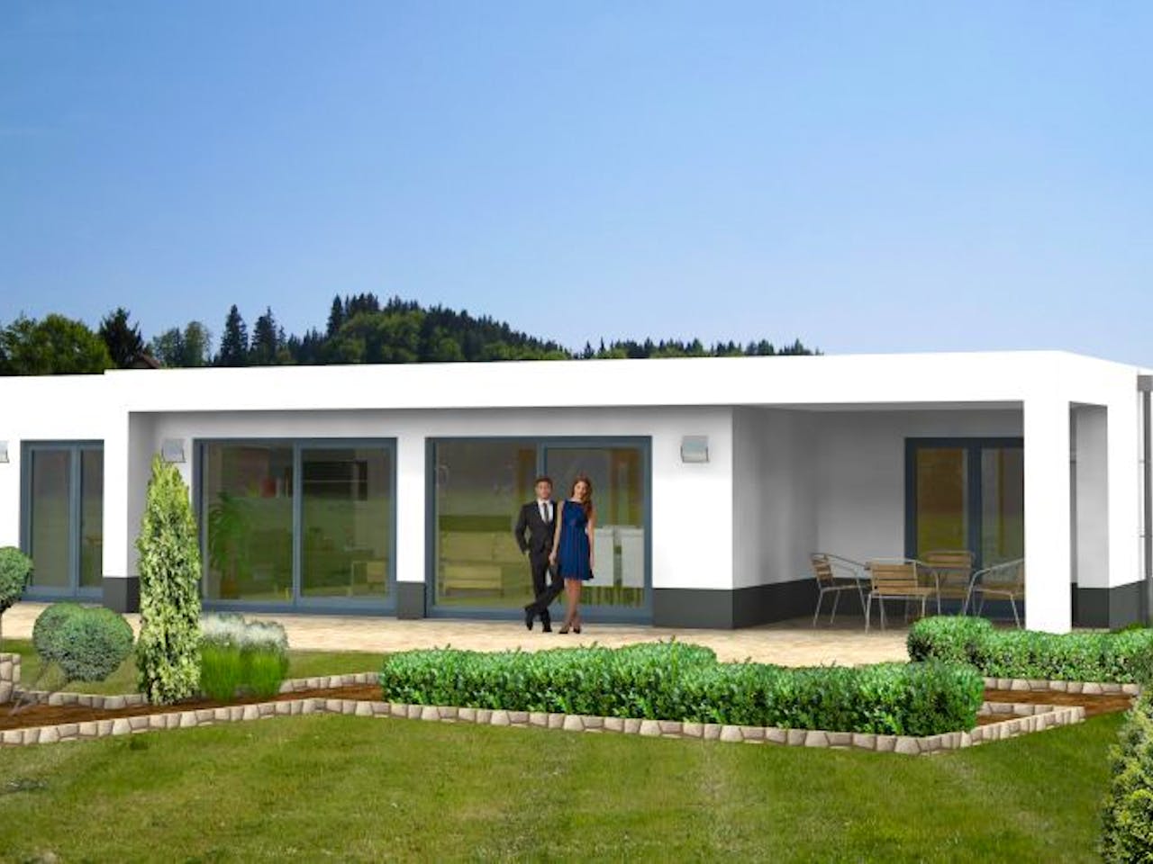 Die Architektur des Bungalows Isenburg 20-017 besticht durch ein modernes Flachdach. Dieser Stil unterstreicht die klare Linienführung und ermöglicht eine vollständige Raumausnutzung ohne Dachschrägen. In Kombination mit der Massivbauweise aus Bims oder Ziegel entsteht ein langlebiges Gebäude. Die großzügigen Fensterfronten im offenen Wohnbereich sorgen zudem für eine helle und freundliche Atmosphäre.