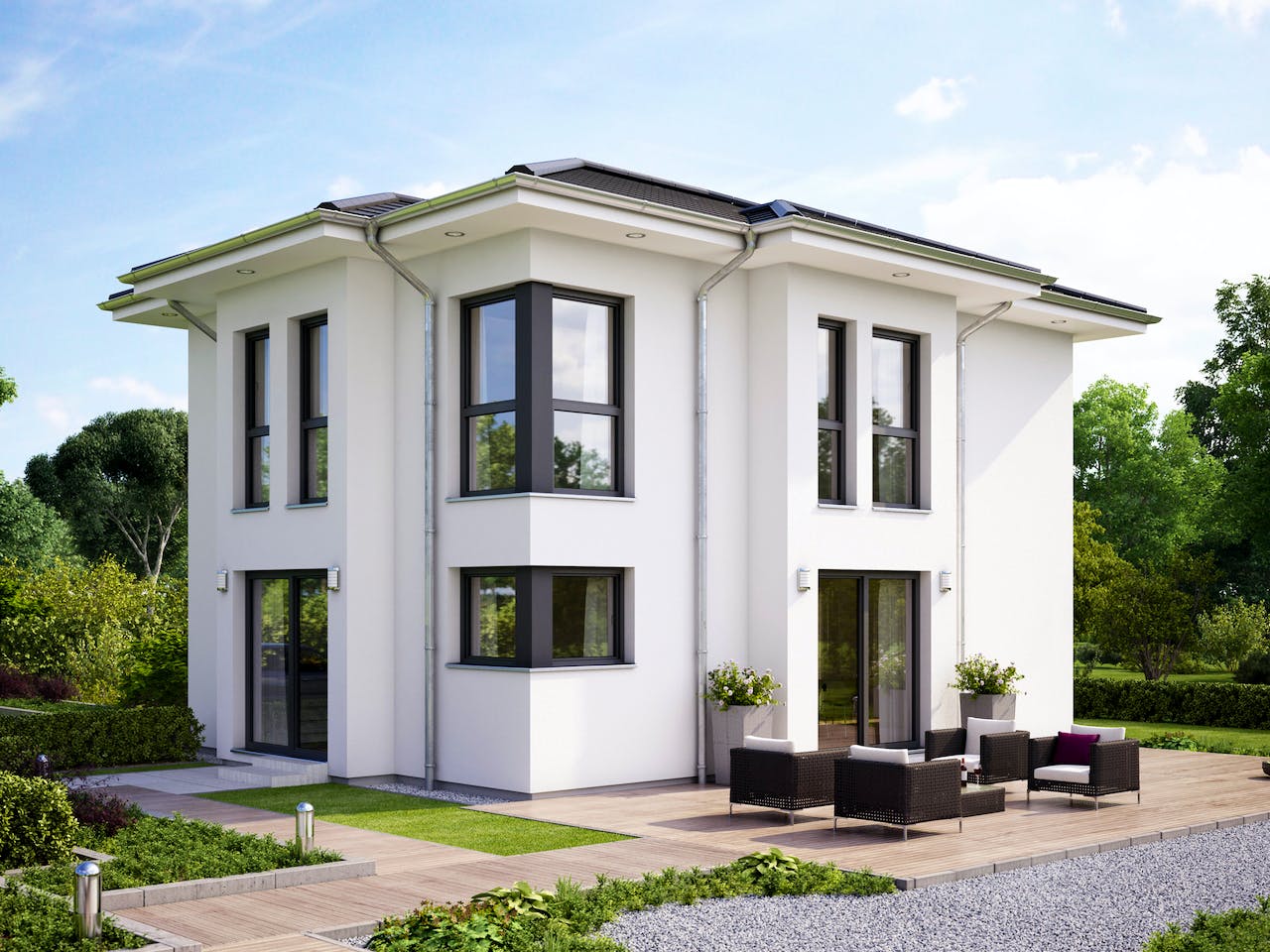 Das elegante Walmdach verleiht dem Haus seinen klassischen Stadtvilla-Charakter und sorgt für eine zeitlose Optik. Ein großer Vorteil ist das vollwertige Obergeschoss ohne störende Dachschrägen. Dadurch genießen Sie in allen Zimmern der oberen Etage maximale Freiheit bei der Möbelplanung und eine großzügige Stehhöhe, was den Wohnkomfort für Ihre Familie deutlich erhöht.