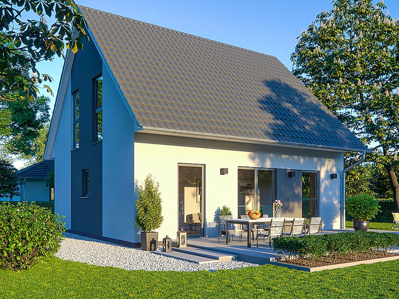 Das Haus überzeugt durch ein klassisches Satteldach mit einer Neigung von 45 Grad. Besonders markant sind die bodentiefen Fenster im Wohnbereich, die für eine helle, einladende Atmosphäre sorgen. Der Kniestock von 80 cm ermöglicht zudem eine effiziente Nutzung des Dachgeschosses. Wir finden, dass dieser Entwurf moderne Offenheit ideal mit traditioneller, massiver Bauweise kombiniert.