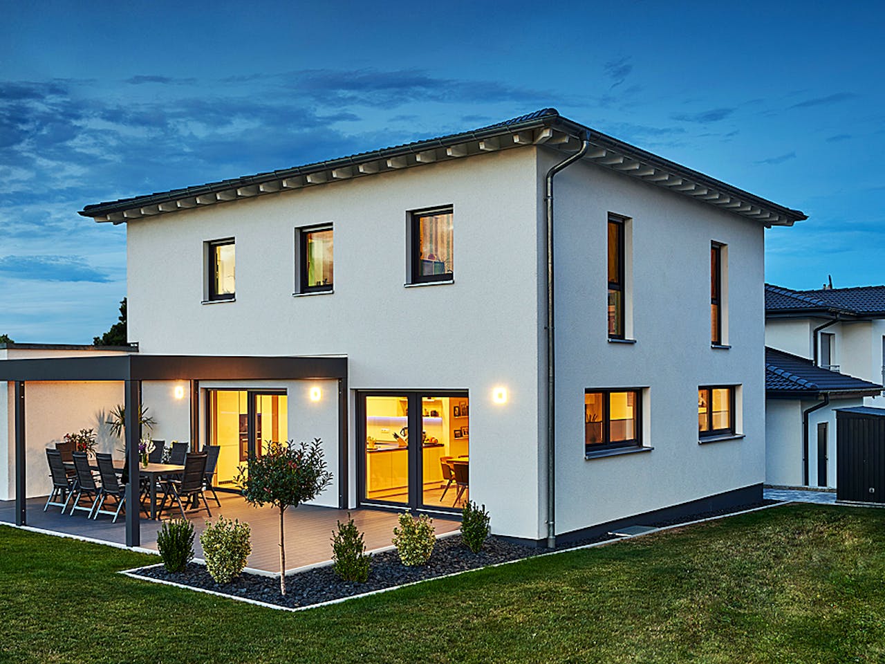 Die Gestaltung als Stadtvilla mit einem flachen Walmdach ermöglicht Ihnen zwei vollwertige Geschosse ohne Dachschrägen. Dadurch gewinnen Sie im Obergeschoss maximale Stellfläche für Schränke und Möbel. Die kompakte, quadratische Form sorgt zudem für kurze Wege im Haus und eine effiziente Raumnutzung, was das Wohnen besonders komfortabel und flexibel für Ihre Familie macht.