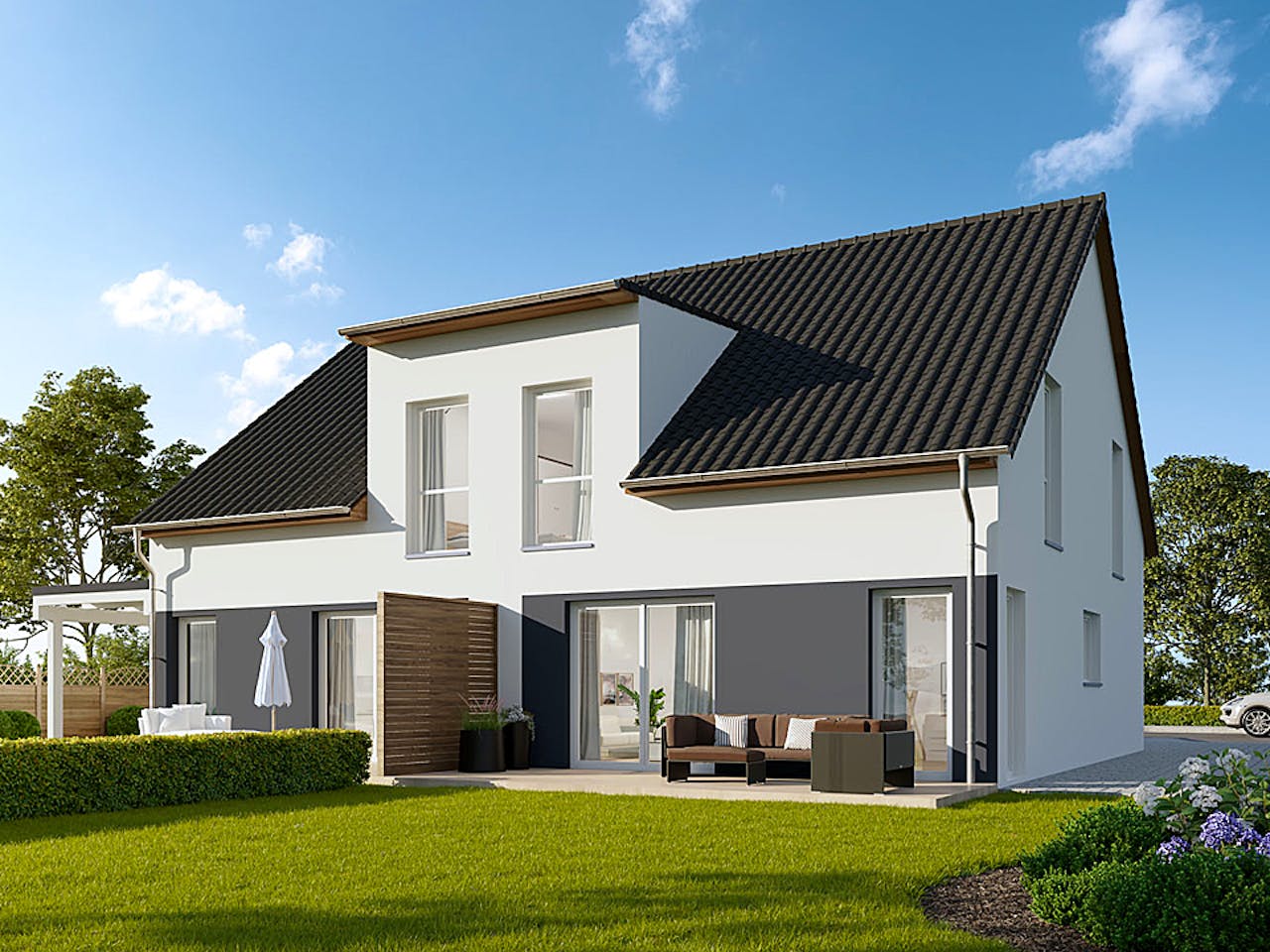 Für dieses klassische Doppelhaus mit einer Grundfläche von etwa 82 m² empfehlen wir eine Grundstücksgröße von mindestens 400 m². Darin sind circa 50 m² für Stellplätze sowie eine großzügige Gartenfläche von rund 260 m² bereits berücksichtigt. So bleibt ausreichend Platz für Ihre Privatsphäre und die Einhaltung der nötigen Abstandsflächen zu den Nachbargrundstücken.