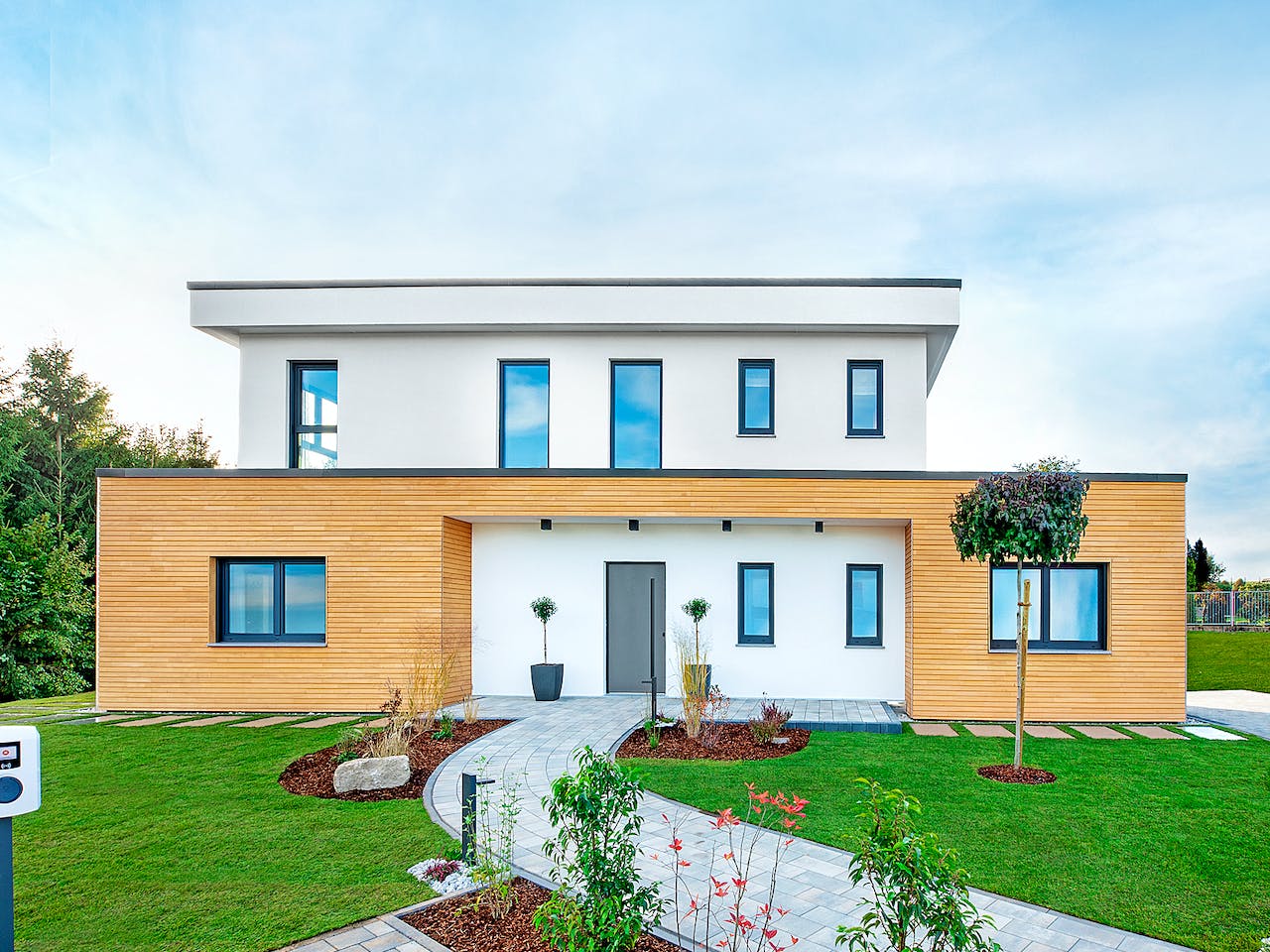 Gegensätze ziehen sich an. Purismus verbunden mit Holzelementen – das spiegelt das heutige Bedürfnis vieler Menschen nach Moderne und gleichzeitiger Wärme wider. Der Hausentwurf „Vilago Neunkhausen“ ist das Sinnbild des zeitlosen Bauhausstils, gepaart mit Behaglichkeit und Extravaganz. Die an der Fassade integrierten Holzelemente ziehen alle Blicke auf sich und interpretieren den knapp 194 m2 großen Designklassiker in seiner modernsten und zugleich natürlichsten Form. Das Flachdachgebäude, das sich über zwei Etagen erstreckt, zeigt zum einen, wie unab¬hängig ein Bauhaus vom Baumaterial ist und zum anderen die große Wandelbarkeit. Ein individueller Mix der Strukturen und Elemente, der seinesgleichen sucht!