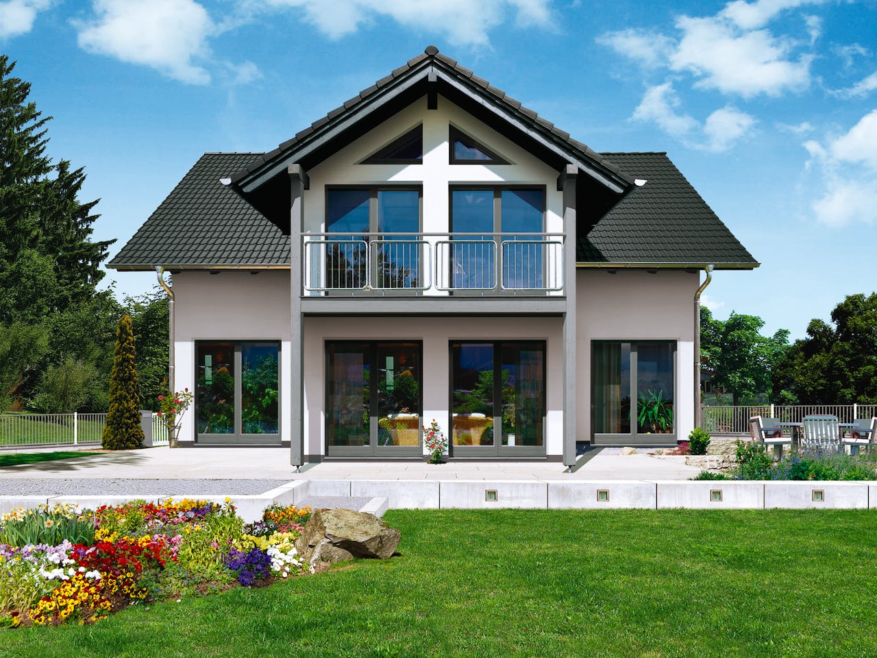 Das Felico ist ein klassisches Satteldachhaus mit 30 Grad Dachneigung und einem hohen Kniestock von 140 cm. Ein Highlight ist der Giebel, der den Wohn- und Essbereich optisch trennt, ohne die Transparenz zu verlieren. Bodentiefe Fenster fluten die sechs Zimmer mit viel Licht. Das Elternschlafzimmer im Dachgeschoss überzeugt zudem durch einen privaten Balkon.