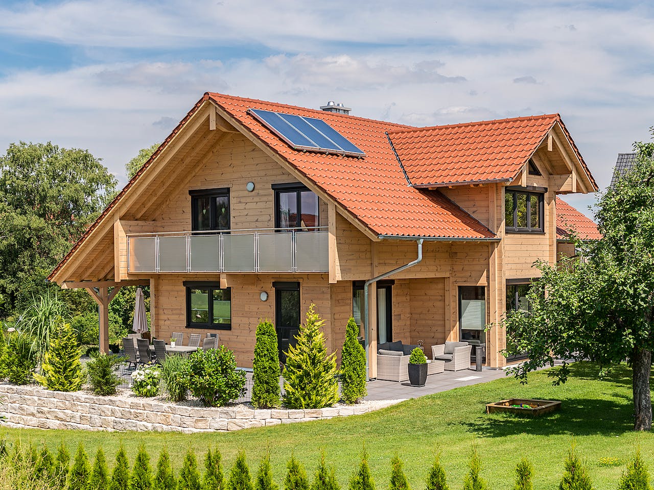 Das Haus besticht durch sein markantes Satteldach mit 35 Grad Neigung und ein zweigeschossiges, verglastes Zwerchhaus. Diese Konstruktion sorgt für besonders viel natürliches Licht im Innenraum. Die Verwendung von massivem, chemisch unbehandeltem Kiefernholz verleiht dem Gebäude einen klassischen Landhaus-Charakter. Zudem bieten die großen Balkone an beiden Giebelseiten attraktive Rückzugsorte im Freien.