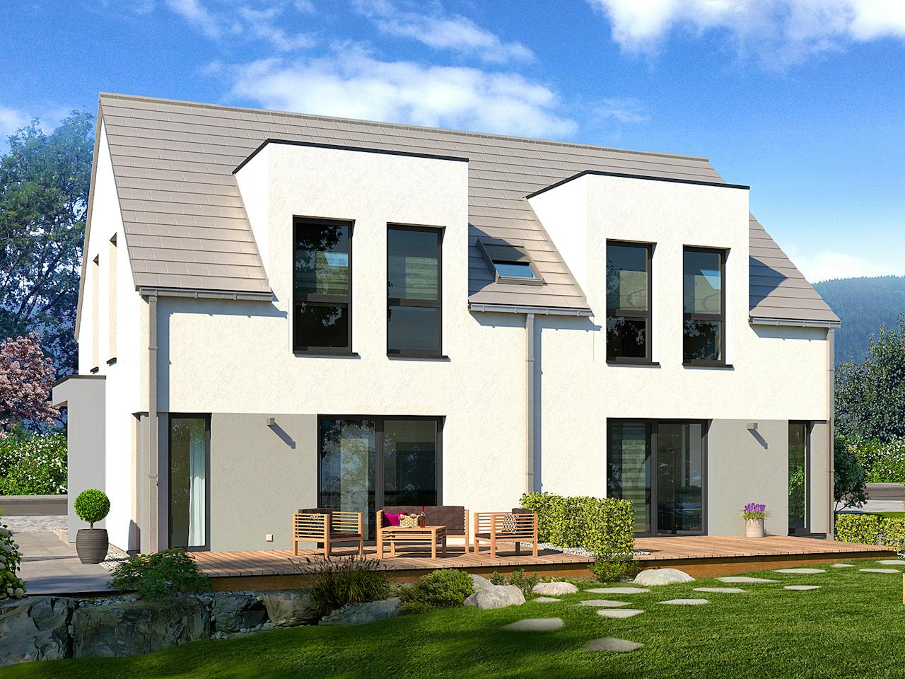 Das Haus überzeugt durch ein klassisches Satteldach mit 38 Grad Neigung und einen Kniestock von 75 cm. Diese Bauweise schafft im Obergeschoss viel nutzbaren Wohnraum. Besonders hervorzuheben ist die integrierte Einliegerwohnung im Erdgeschoss. Sie ermöglicht ein harmonisches Zusammenleben mehrerer Generationen unter einem Dach, wobei jede Partei ihre Privatsphäre sowie einen eigenen Zugang zum Garten genießt.