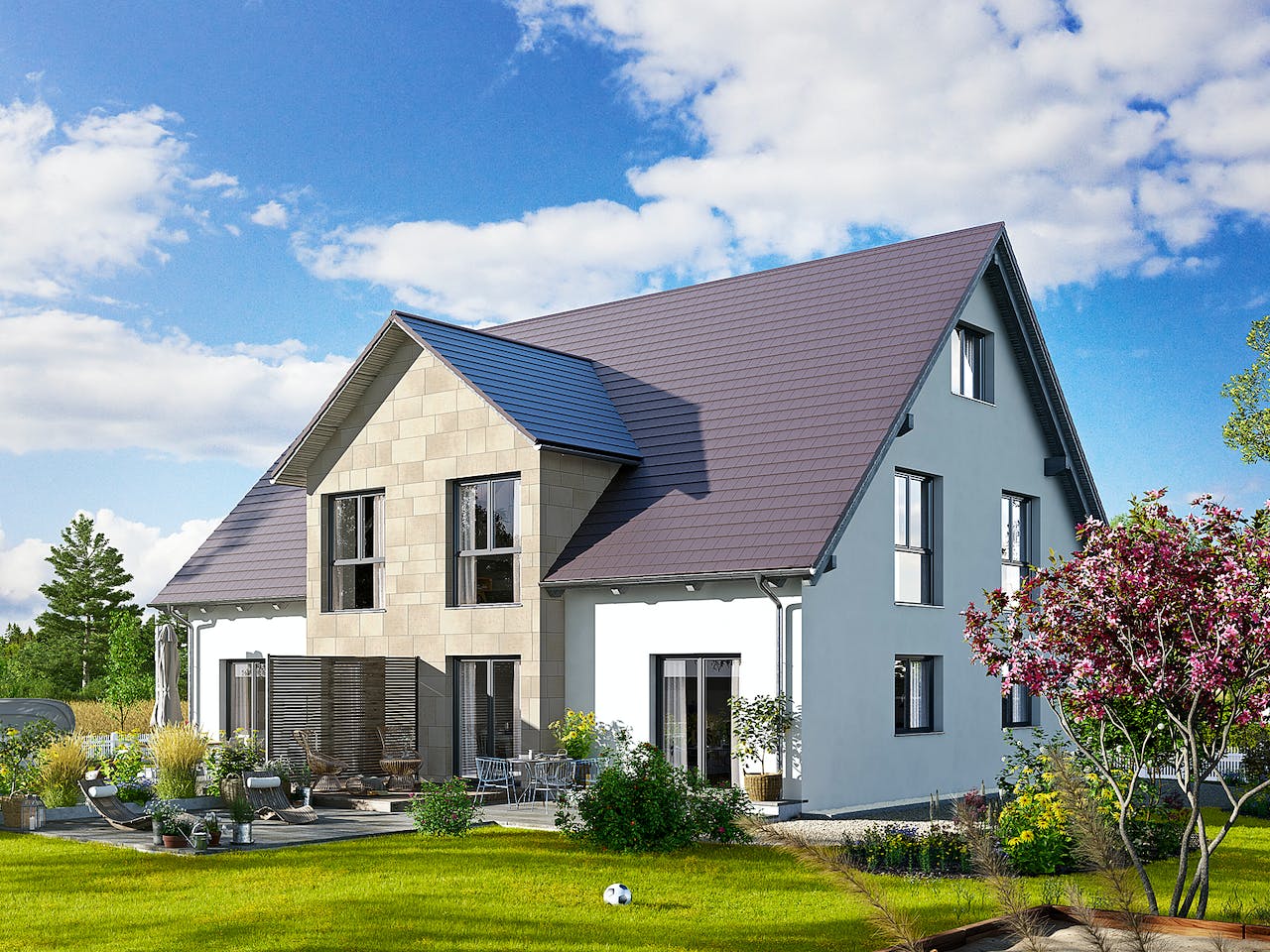 Ein Zweifamilienhaus wie das Duo 315 bietet gegenüber einem Doppelhaus eine Reihe von finanziellen Vorteilen, da z. B. die Erschließungskosten für das Grundstück und die Anschaffungskosten für Haus- und Heiztechnik nur einmal anfallen.