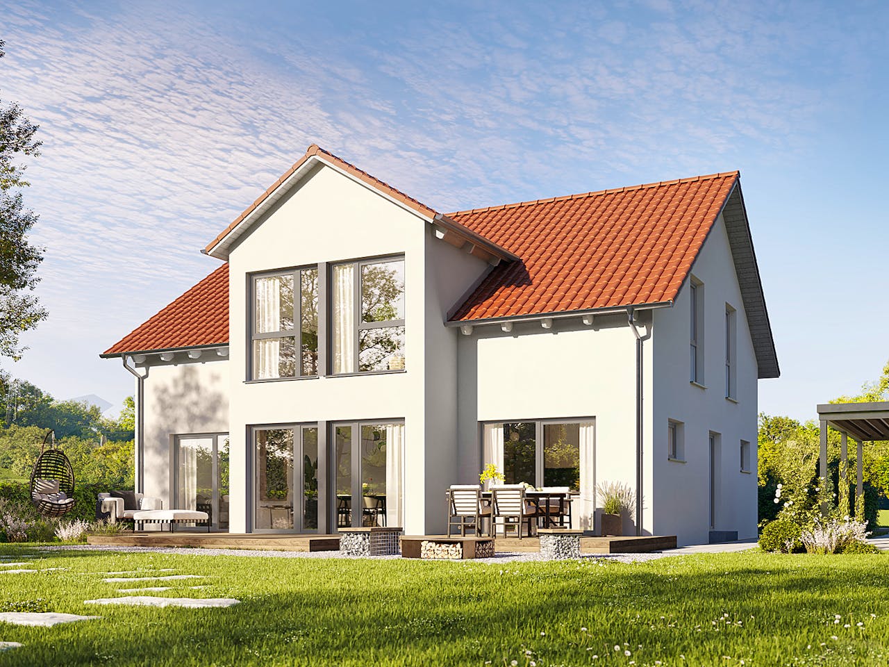 Das klassische Satteldach mit einer Neigung von 35 Grad verleiht dem Haus zeitlose Eleganz. Dank eines Kniestocks von 120 cm gewinnen Sie im Dachgeschoss wertvollen Wohnraum mit hoher Stellfläche für Möbel. Diese Bauweise kombiniert traditionelles Design mit moderner Flächennutzung, was besonders den drei großzügigen Kinderzimmern und dem Elternschlafzimmer mit integrierter Ankleide zugutekommt.