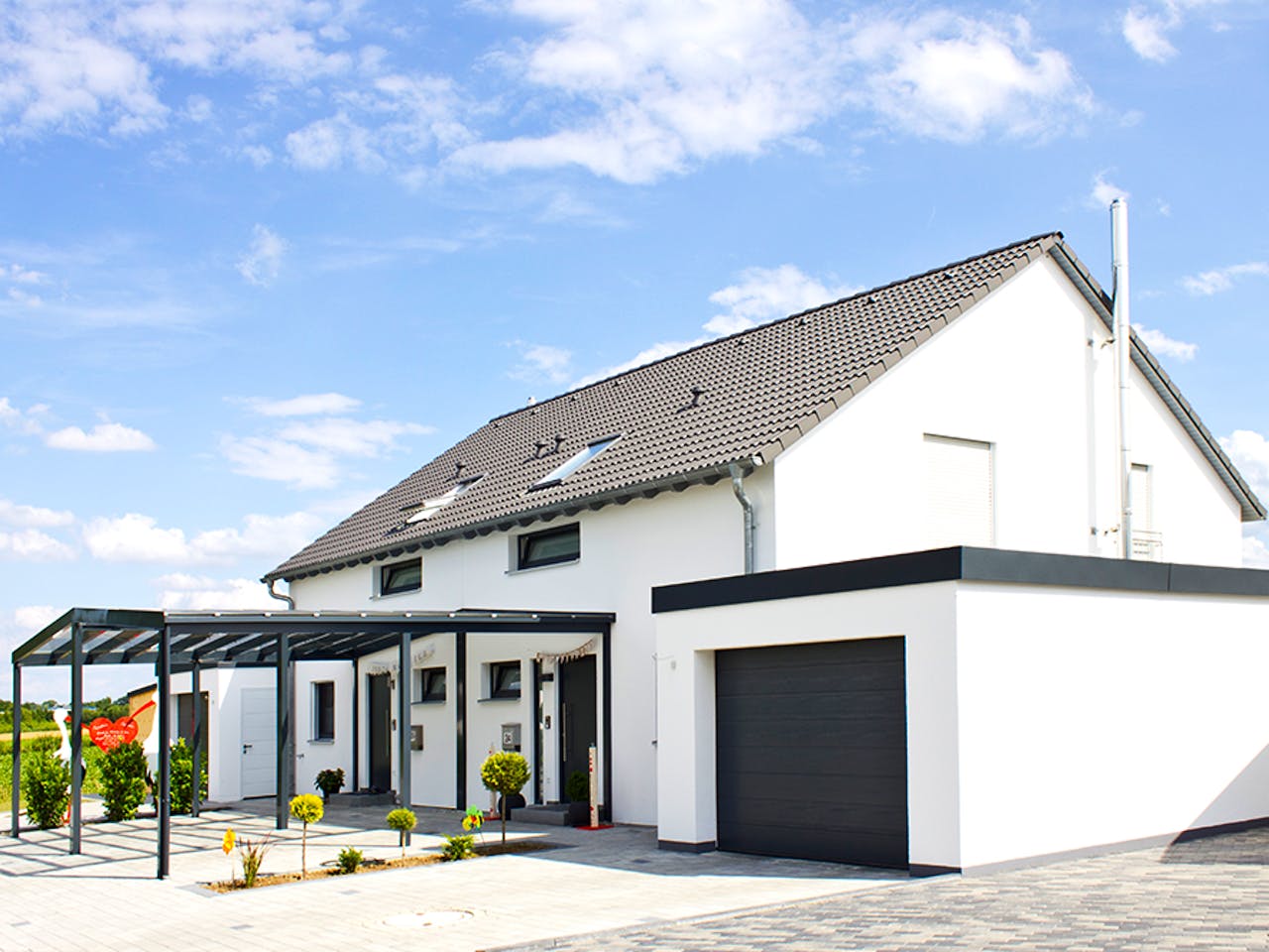 Für dieses Doppelhaus mit einer Grundfläche von etwa 81 m² empfehlen wir eine Grundstücksgröße von mindestens 400 m². Darin sind Stellplatzflächen von ca. 50 m² und eine großzügige Gartenfläche bereits enthalten. So stellen wir sicher, dass trotz der kompakten Außenmaße von 11 mal 7,4 Metern ausreichend Freiraum für beide Wohneinheiten bleibt.