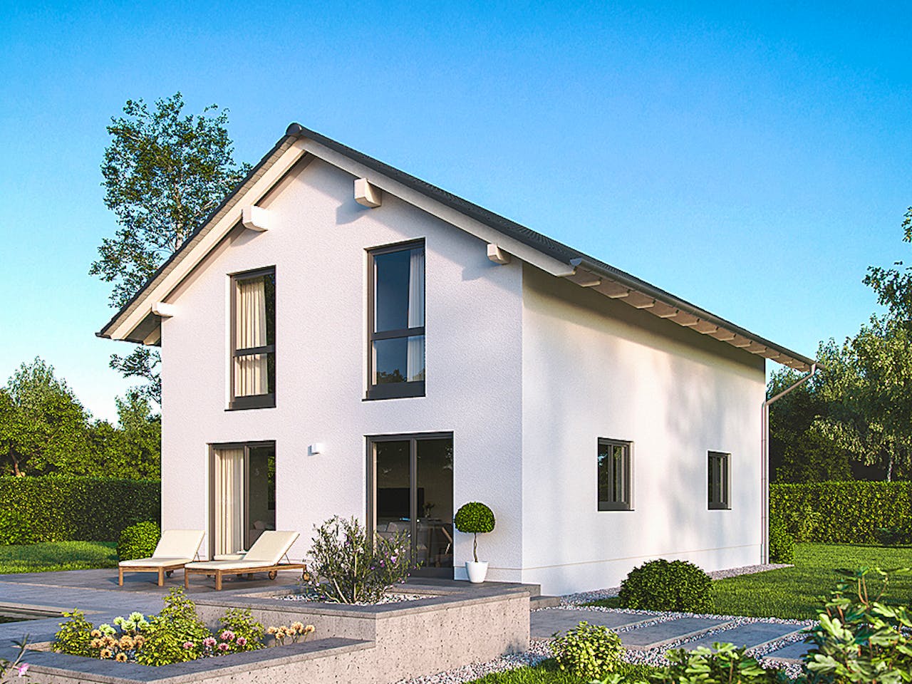 Dieser Satteldach-Klassiker besticht durch seinen modernen Landhausstil mit charakteristischen, sichtbaren Dachsparren. Sie haben bei der Fassadengestaltung die Wahl zwischen einer klassischen Putzfassade oder einer robusten Verblendung. Die Architektur verbindet traditionelle Elemente mit einem offenen Wohnkonzept auf zwei Etagen. Über uns können Sie weitere Details zur individuellen Ausstattung anfragen, um das Haus perfekt an Ihren persönlichen Stil anzupassen.