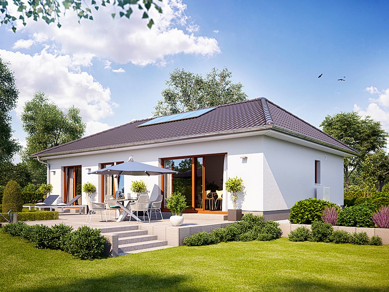 Dieser Bungalow besticht durch sein klassisches Walmdach mit einer Neigung von 25 Grad. Diese Dachform verleiht dem Haus eine zeitlose Eleganz und schützt die Fassade optimal vor Witterungseinflüssen. Als Massivhaus konzipiert, vereint es Beständigkeit mit einem modernen Wohngefühl auf einer Ebene, was besonders für barrierefreies Wohnen im Alter oder für kleine Familien ideal ist.