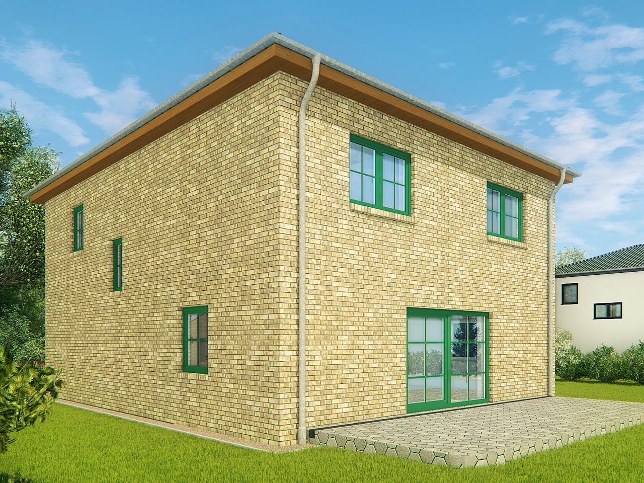 Die Architektur besticht durch ein klassisches Walmdach mit einer Neigung von 22 Grad, was dem Gebäude eine zeitlose Eleganz verleiht. Dank der zwei Vollgeschosse entstehen keine störenden Dachschrägen, wodurch Sie die Wohnfläche von 156 m² uneingeschränkt nutzen können. Große Fensterfronten sorgen zudem für lichtdurchflutete Räume und unterstreichen das moderne, offene Wohnkonzept dieser massiv gebauten Stadtvilla.
