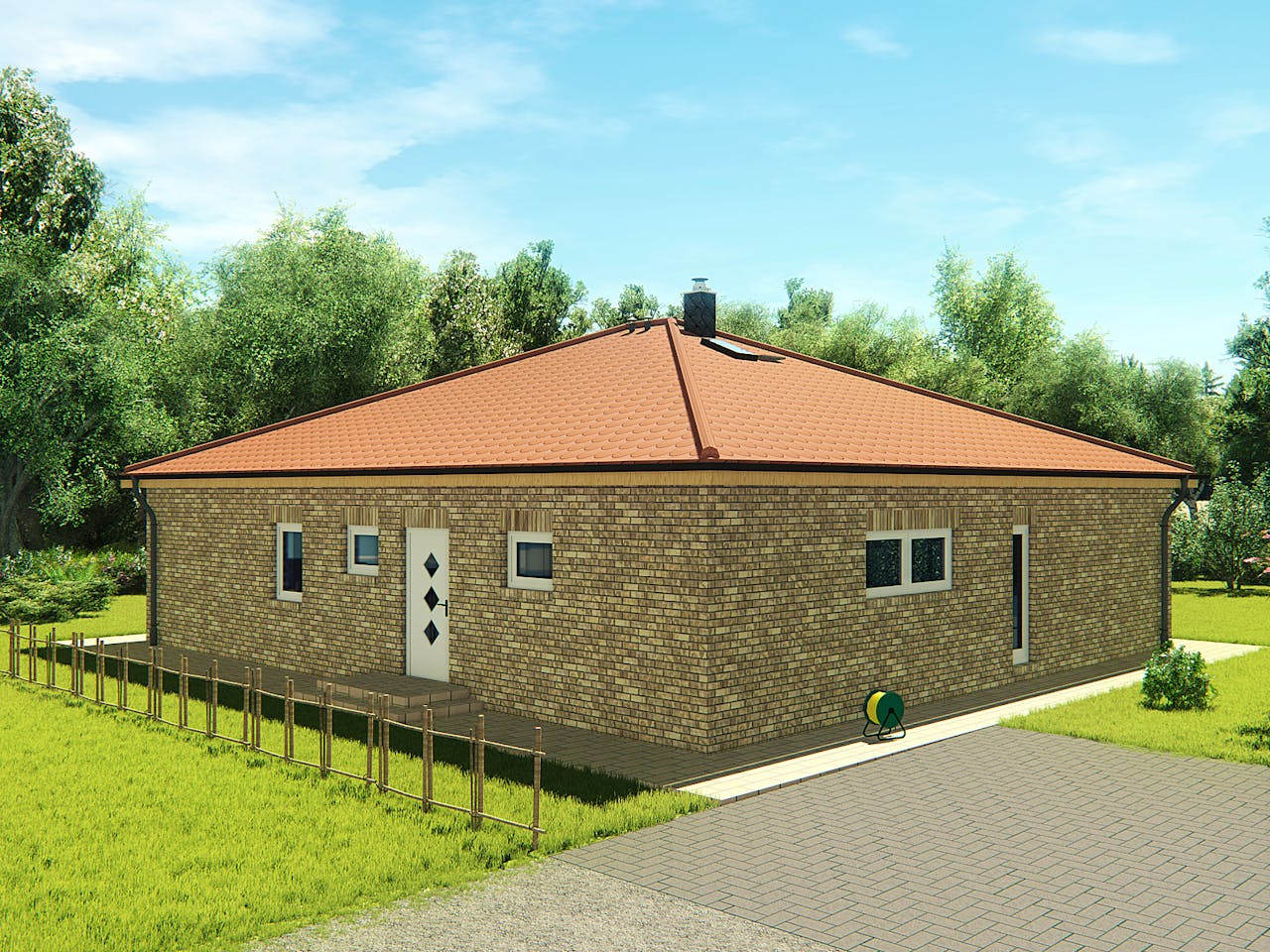 Die charakteristische Winkelform schafft einen geschützten Terrassenbereich, der wie ein zusätzliches Freiluftzimmer fungiert. Dies erhöht Ihre Privatsphäre und bietet Schutz vor Wind. Kombiniert mit dem klassischen Walmdach und der eleganten Klinkerfassade entsteht ein repräsentatives Erscheinungsbild. Diese Architektur ermöglicht zudem eine klare Trennung zwischen dem großzügigen Wohnbereich und den privaten Schlafräumen auf einer Ebene.