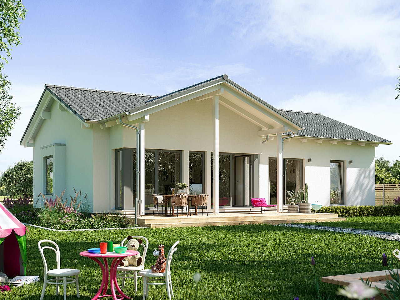 Das Modell besticht durch ein klassisches Satteldach mit einer flachen Neigung von 22 Grad, was ihm eine moderne Optik verleiht. Besonders attraktiv ist das barrierefreie Wohnen auf einer Ebene. Dank flexibler Erweiterungen wie Giebelerkern oder Panorama-Eckfenstern können wir gemeinsam mit Ihnen das Design individualisieren, um den Bungalow perfekt an Ihren persönlichen Geschmack und Lebensstil anzupassen.