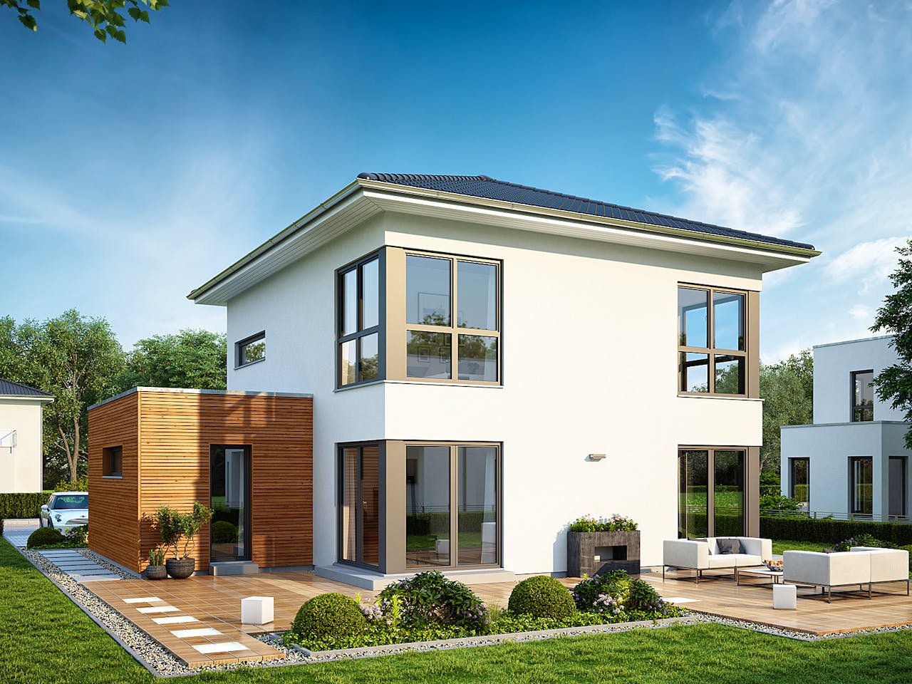 Diese Stadtvilla besticht durch ihr klassisches Walmdach mit einer Neigung von 22 Grad. Das Besondere an diesem Modell ist die enorme Flexibilität: Der Grundriss lässt sich wahlweise auch mit einem Satteldach oder Flachdach realisieren. Die zweigeschossige Bauweise sorgt zudem für ein großzügiges Raumgefühl und bietet volle Raumhöhe im Obergeschoss ohne störende Dachschrägen.