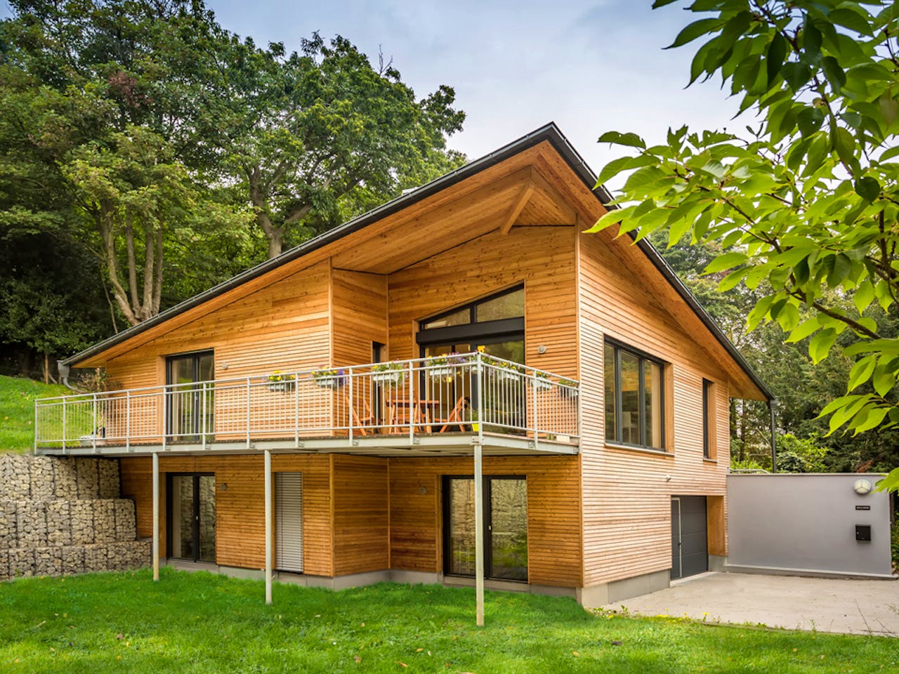 Dieses Naturholzhaus überzeugt nicht nur durch höchste Energiestards, sondern auch mit seiner einzigartigen Architektur. Die Entwurfsidee ist bis ins kleinste Deteil abgestimmt auf die geografischen und landwirtschaftlichen Gegebenheiten. Das Passivhaus öffnet sich nach Süden und Osten. Der außergewöhnliche Dachstauhl orientiert sich an den sanften Hügeln der Umgebung und spendet, dank seines Überstands, im Sommer ausreichend Schatten. Für unsere Baufamilie entstand so ein höchst energieeffizientes und wohngesundes Zuhuase - eingebettet in die schöne Naturlandschaft