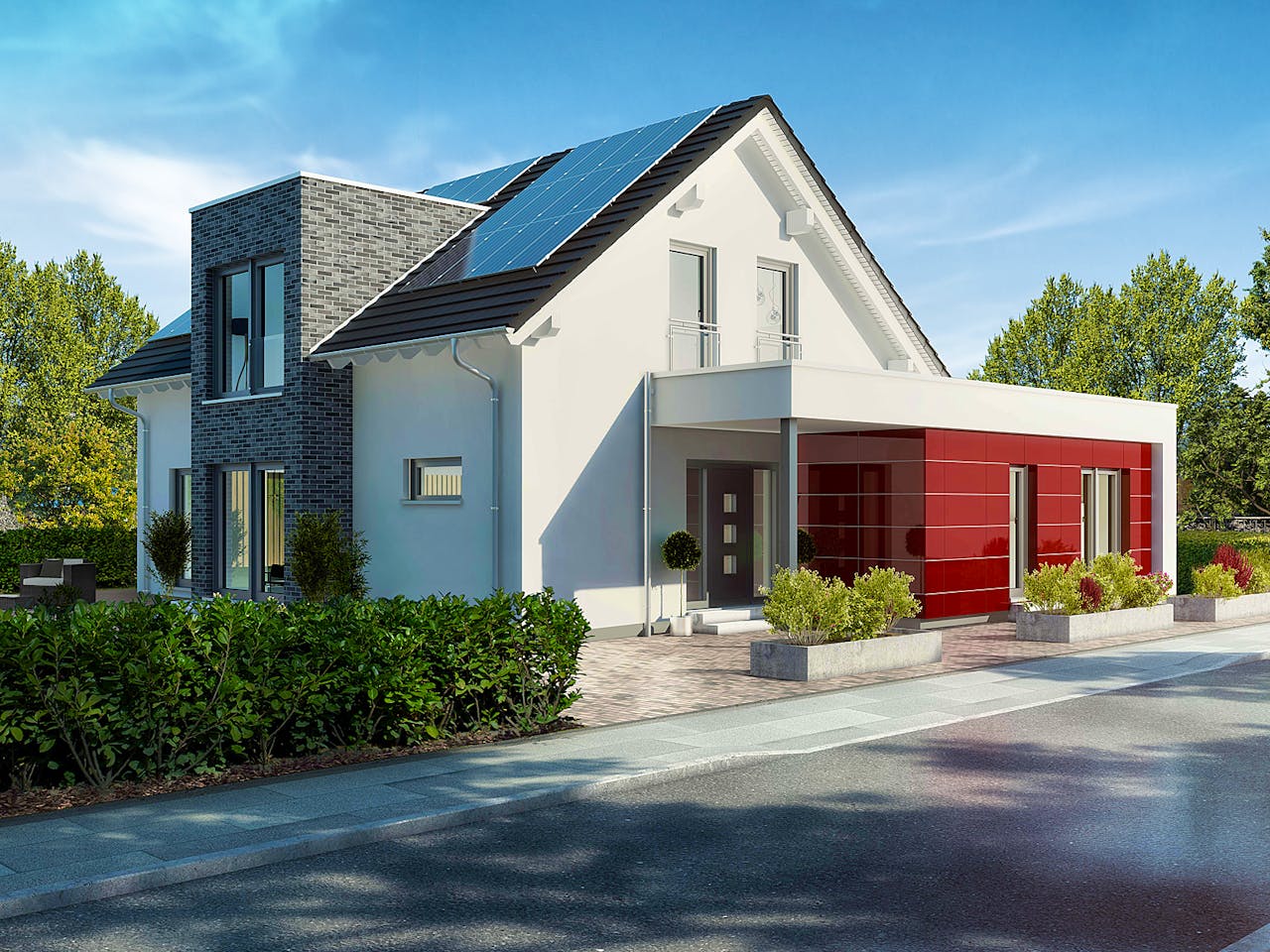 Das Musterhaus Langenhagen besticht durch eine spannende Kombination aus Tradition und Moderne. Besonders hervorzuheben sind das verklinkerte Zwerchhaus und die auffällige rote Glasfassade. Im Obergeschoss erwartet Sie ein beeindruckender Studioausbau mit Deckenhöhen von bis zu 3,50 Metern. Diese Details verleihen dem klassischen Satteldachhaus einen sehr individuellen und repräsentativen Charakter für zwei Parteien.