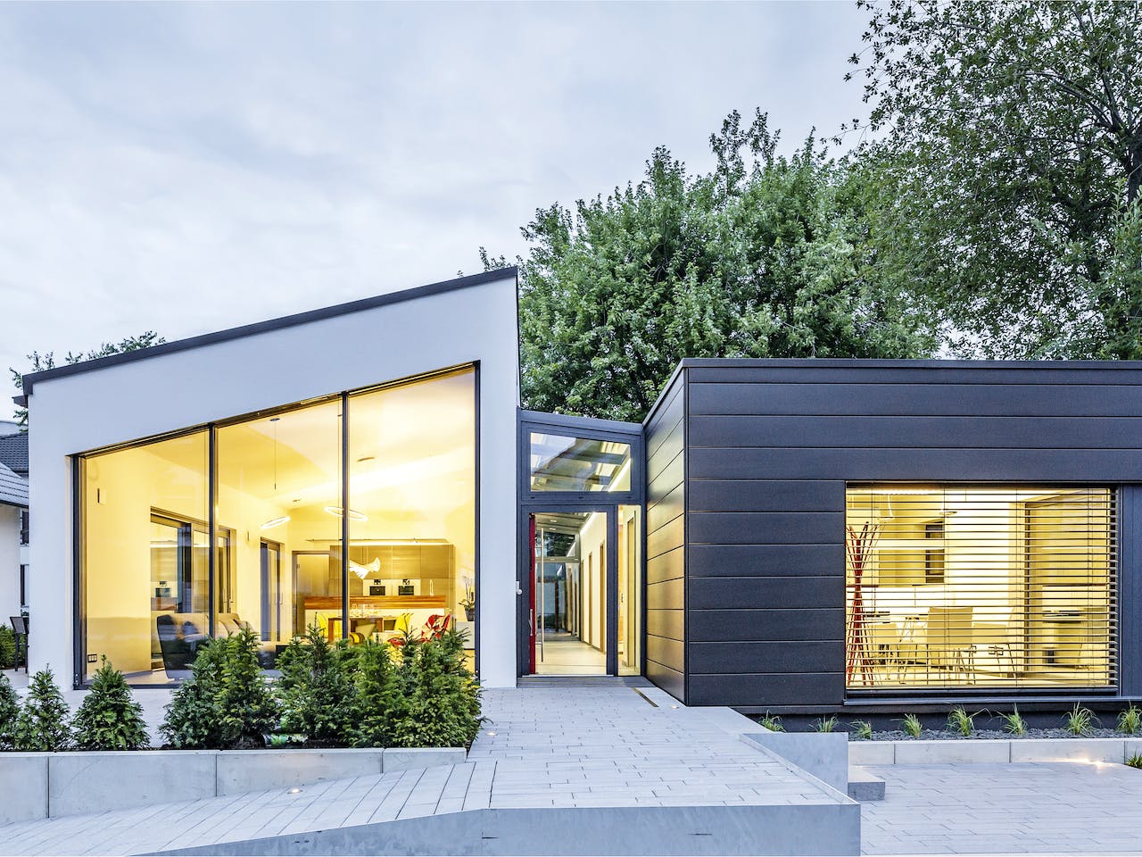 Dieser Bungalow besticht durch seinen modernen Loftstil und das markante Pultdach mit einer Neigung von 13 Grad. Die Architektur kombiniert repräsentativen Anspruch mit lässigem Wohnkomfort auf einer Ebene. Besonders hervorzuheben ist das offene Raumkonzept, das durch hochwertige Materialien und die innovative Climatic-Wand ergänzt wird. So entsteht ein gesundes Wohlfühlklima für die gesamte Familie.