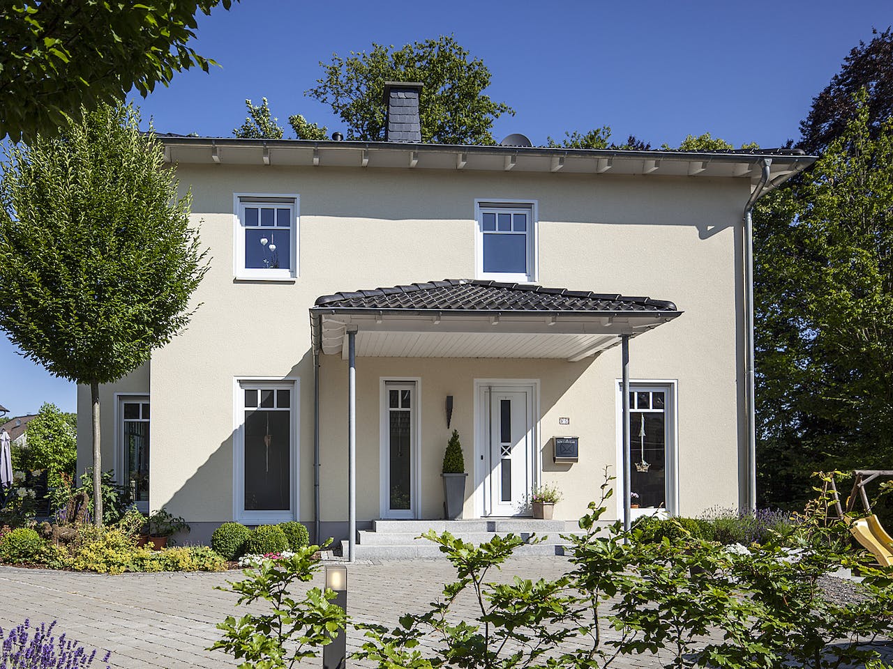 Eine der schönsten und komfortabelsten Bauformen der mediterranen Architektur ist die zweigeschossige Stadtvilla mit nahezu quadratischem Grundriss. Haus Conrad ist eine besonders repräsentative Variante dieser Bauform, was zum einen an einer klaren Formensprache, zum anderen an einem Farbkonzept liegt, das weiße Fenster und einen warmen Gelbton für die Fassade mit einer Dacheindeckung in Anthrazit verbindet.