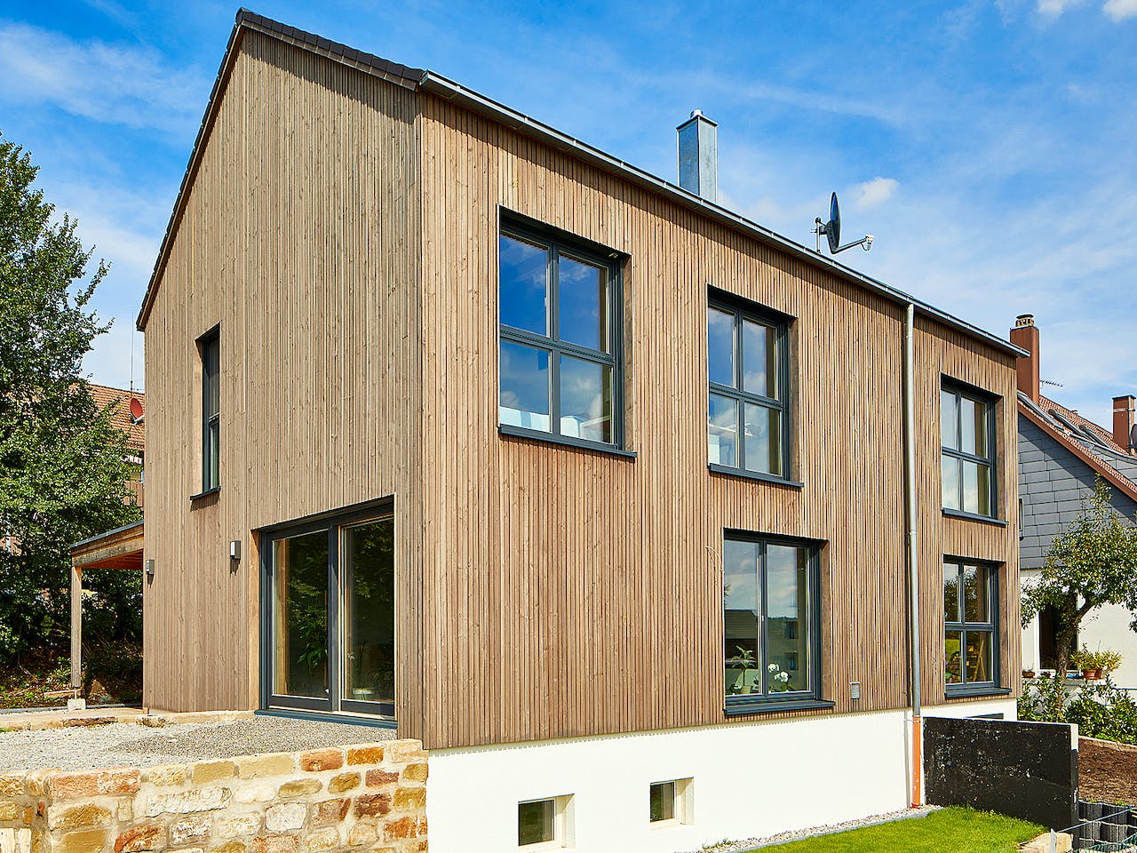 Dieses Haus nutzt massive Holzmauer-Elemente mit einer ökologischen Holzfaserdämmung. Das Besondere ist die diffusionsoffene Bauweise, die komplett ohne Dampfsperrfolien auskommt. Dies sorgt für ein gesundes Raumklima und einen hervorragenden sommerlichen Hitzeschutz. Die Fassade kombiniert Putz mit einer hochwertigen Holzverschalung für eine moderne, natürliche Optik, die individuell an Ihre Wünsche angepasst werden kann.