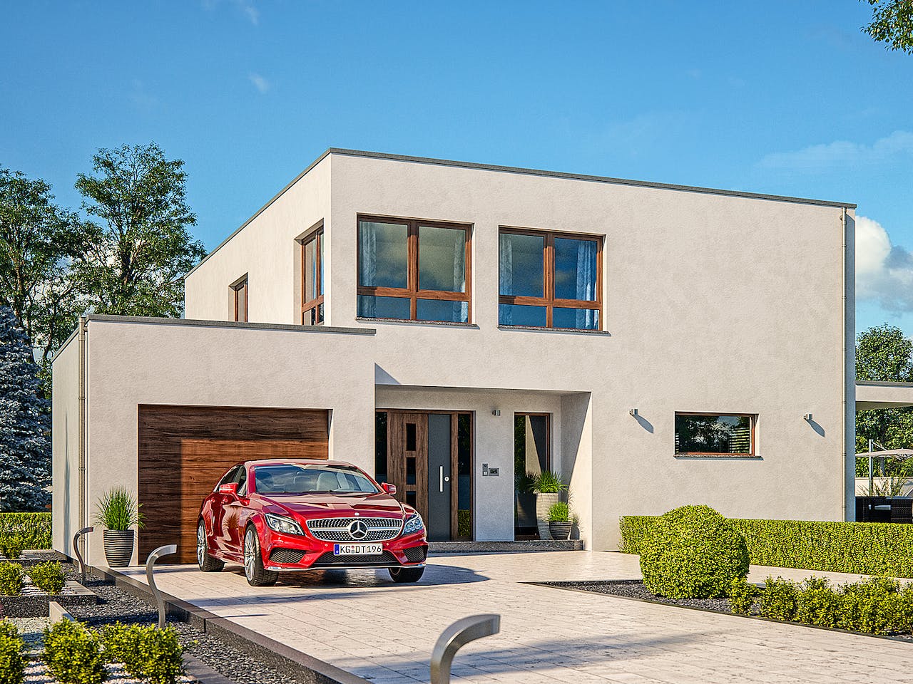 Das Haus Toronto besticht durch seine markante Kubus-Architektur im modernen Bauhaus-Stil. Ein Highlight ist das Flachdach kombiniert mit einer integrierten Loggia, die von filigranen Rahmen umgeben wird. Große Glasflächen im Erdgeschoss sorgen für lichtdurchflutete Räume und verbinden das Drinnen mit dem Draußen. Diese puristische Gestaltung verleiht dem Einfamilienhaus einen unverwechselbaren und zeitlosen Charakter.