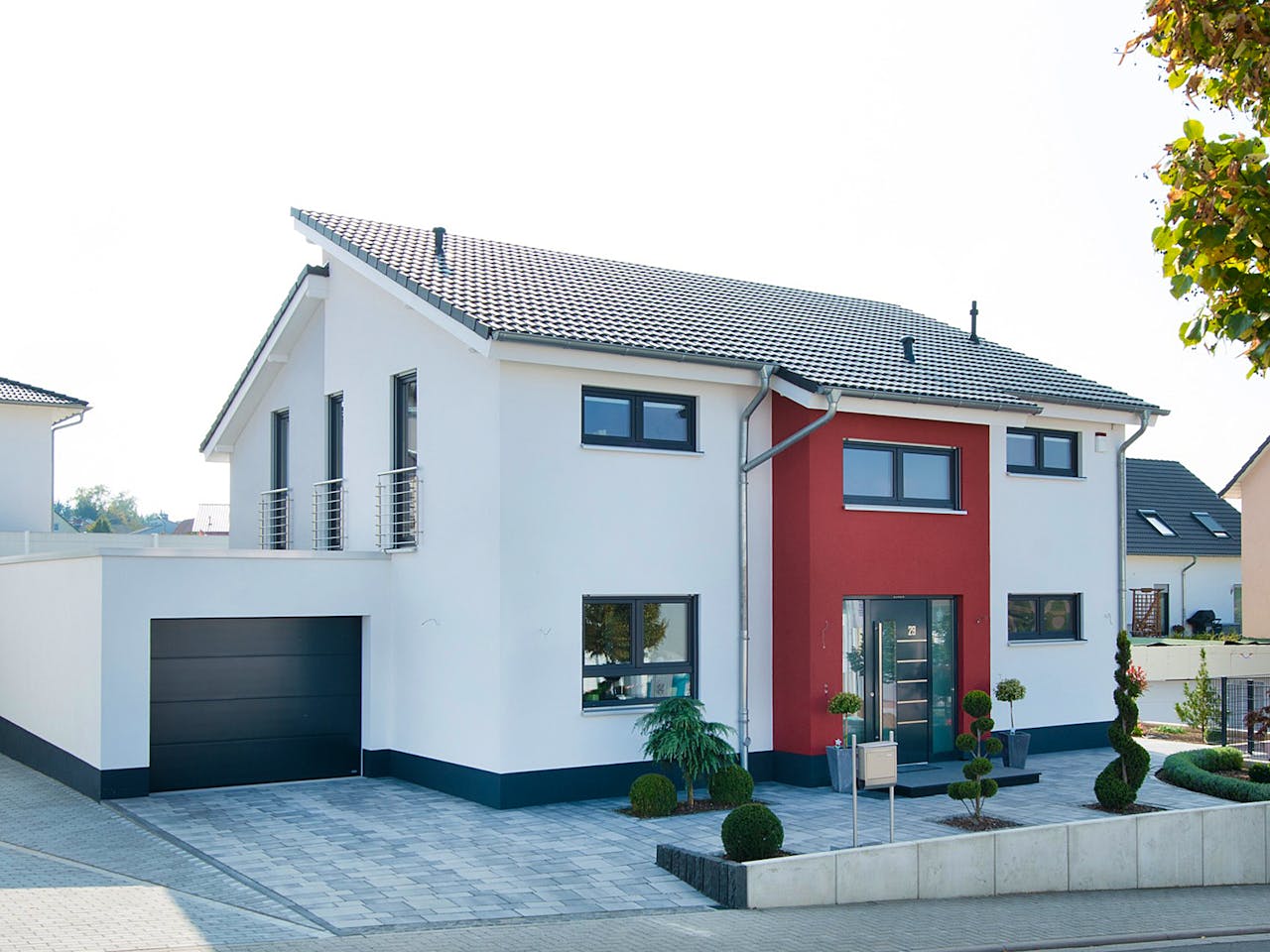 Das Haus besticht durch sein modernes Pultdach und einen hohen Kniestock, was im Obergeschoss für viel Stellfläche sorgt. Ein besonderes Highlight ist die Galerie mit Luftraum, die ein offenes Wohngefühl erzeugt. Die Kombination aus klassischen Elementen und individuellen Farbakzenten an der Fassade macht dieses zweigeschossige Einfamilienhaus zu einem echten Blickfang in jedem Neubaugebiet.