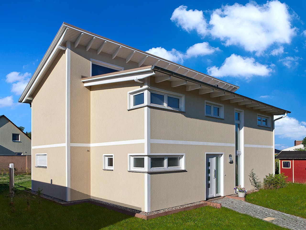 Das Haus besticht durch zwei versetzt geneigte Pultdächer und eine moderne Übereck-Verglasung. Diese Kombination verleiht dem Gebäude ein unverwechselbares, urbanes Äußeres. Ein markantes Lichtband über beide Etagen sorgt im Eingangsbereich für eine helle, einladende Atmosphäre. Wir finden, dass dieser Entwurf perfekt für Bauherren ist, die eine Vorliebe für zeitgemäße, individuelle Formensprache haben.