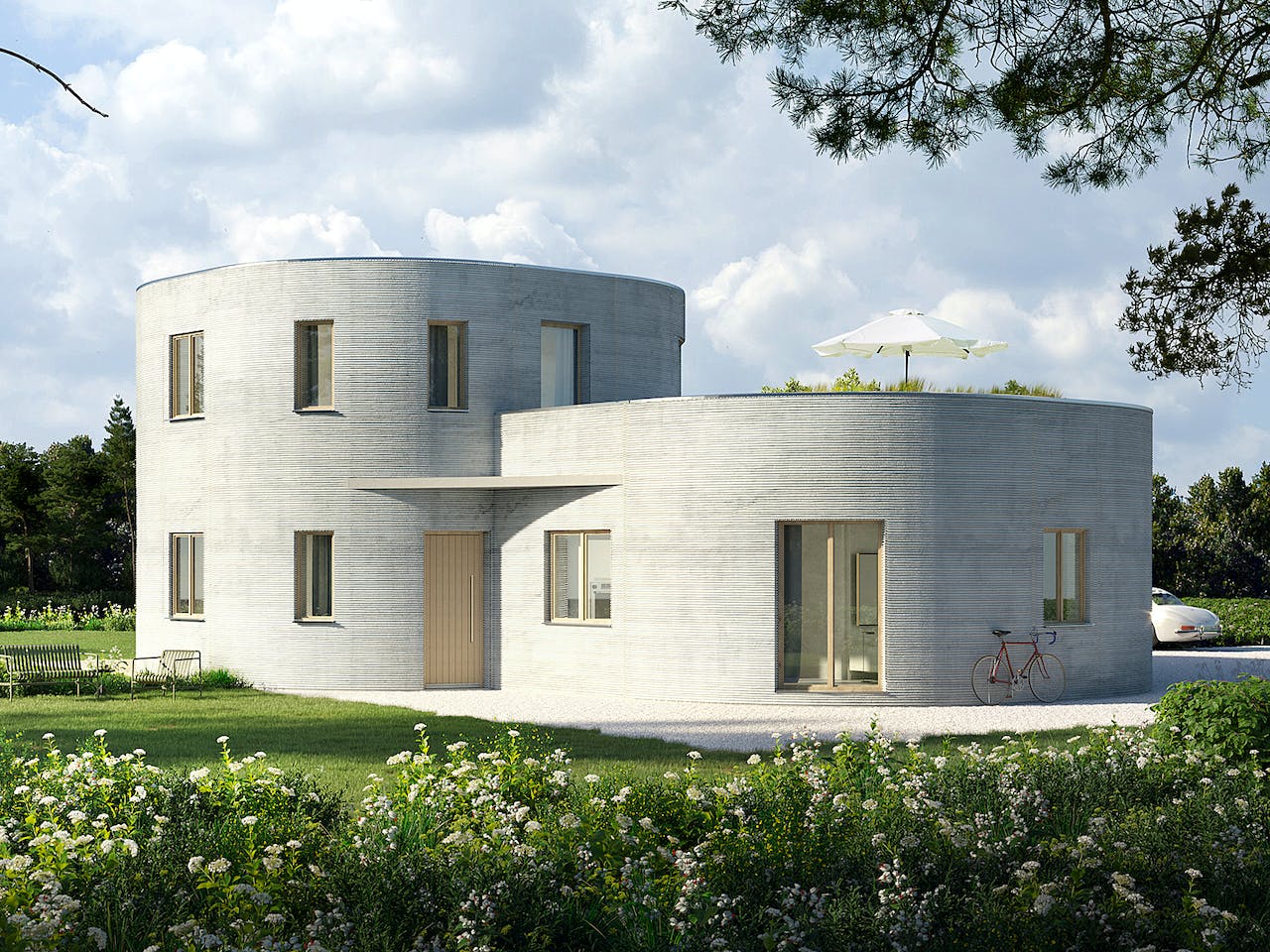Das Haus Calla beeindruckt durch zwei ineinander verschobene Kuben mit markanten abgerundeten Ecken. Diese organische Form wird durch modernste 3D-Druck-Technologie ermöglicht. Ein Highlight ist die großzügige Dachterrasse über dem Wohnbereich. Sie bietet Ihnen wertvollen Freiraum und Platz für Beete oder einen Grillplatz, was besonders bei kompakten Grundstücken in städtischen Lagen einen enormen Mehrwert darstellt.