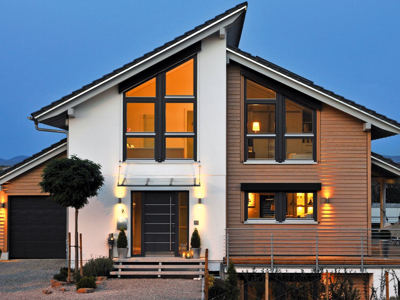 Das Haus besticht durch zwei versetzte Baukörper, die eine lebendige Fassadengestaltung ermöglichen. Die Kombination aus modernem Pultdach und dem Einsatz von echtem Holz unterstreicht den zeitgemäßen Charakter. Durch den Hausversatz entstehen im Inneren transparente Grundrisse, die dennoch private Rückzugsmöglichkeiten bieten. Besonders attraktiv ist die Eignung für Hanglagen, wodurch das Untergeschoss flexibel nutzbar wird.