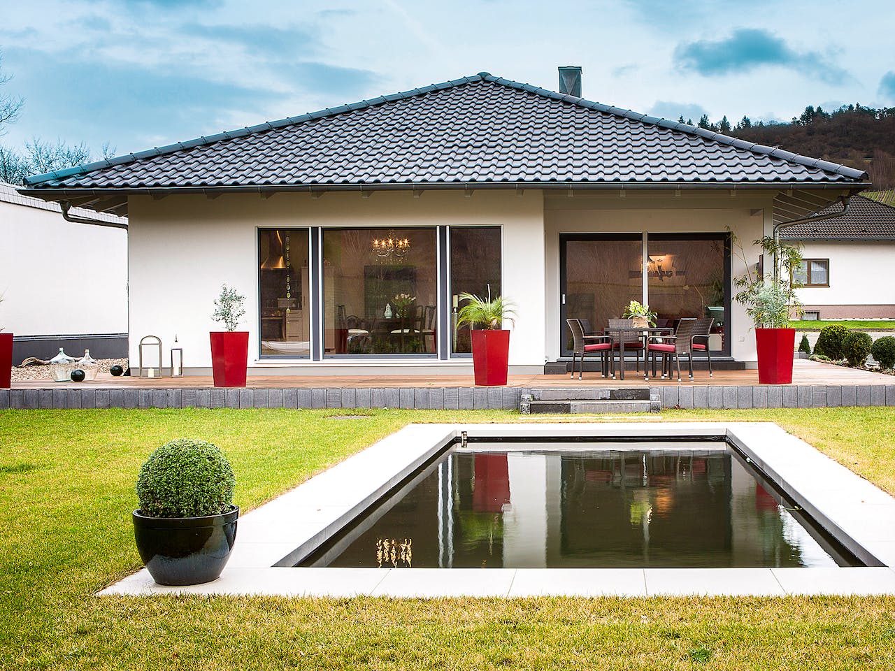 Das klassische Walmdach verleiht dem Bungalow E 10-095.2 eine zeitlose und repräsentative Optik. Durch die geneigten Dachflächen an allen vier Seiten bietet es einen optimalen Schutz der Fassade vor Witterungseinflüssen. Zudem fügt sich diese Bauweise harmonisch in viele Wohngebiete ein. Wir beraten Sie gerne zu den individuellen Gestaltungsmöglichkeiten für Ihr persönliches Traumhaus.