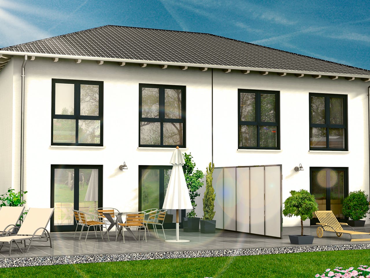Das Stadthaus überzeugt durch ein klassisches Walmdach, das für eine elegante Optik sorgt. Besonders innovativ ist das optionale Massivdach aus Porenbeton. Es funktioniert wie eine dämmende Wand. Dadurch bleibt es im Sommer angenehm kühl, während die Konstruktion gleichzeitig einen hervorragenden Schallschutz bietet. So genießen wir auch in städtischen Lagen eine ruhige Wohnatmosphäre.