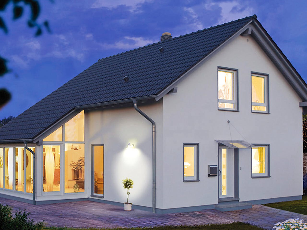 Besonders markant ist der integrierte Wintergarten, der dem klassischen Satteldachhaus eine extravagante Optik verleiht. Er sorgt für einen lichtdurchfluteten Wohn- und Essbereich und vergrößert das Raumgefühl im Erdgeschoss spürbar. Die Kombination aus traditioneller Bauform und modernen Glaselementen schafft ein helles Wohlfühlambiente, das viel Platz für die individuelle Entfaltung bietet.
