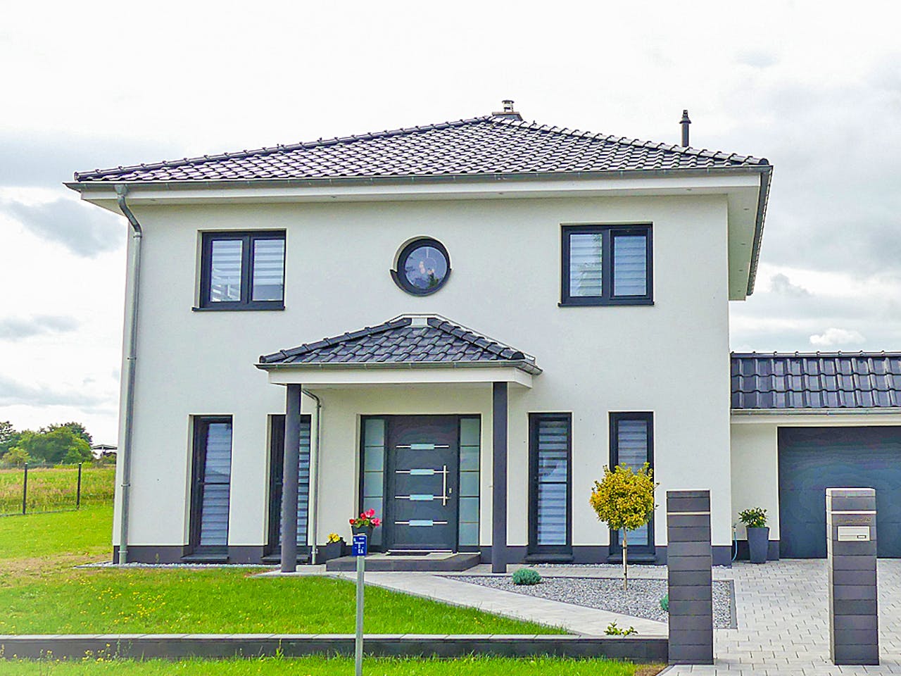 Unsere Stadtvilla V_174 ist ein zweistöckiges Haus, das nicht nur preiswert ist, sondern auch Platz für die ganze Familie bietet. Hier trifft sinnvolle Funktionalität auf modernes städtisches Wohnen.