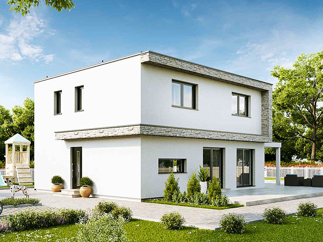 Die Family Edition zeichnet sich durch einen modernen Bauhaus-Stil mit einem klaren Flachdach aus. Im Inneren erwartet Sie ein offenes Raumkonzept, das sich harmonisch um eine zentrale Treppe gruppiert. Besonders attraktiv sind die doppelflügeligen Terrassentüren auf zwei Hausseiten. Diese verbinden den Wohnbereich direkt mit Ihrem Garten und lassen besonders viel Tageslicht in die großzügig geschnittenen Räumlichkeiten fließen.