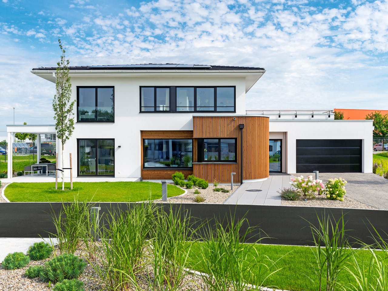 Das Haus besticht durch ein klassisches Walmdach und zwei volle Geschosse ohne Dachschrägen. Besondere Highlights sind der markante Runderker sowie ein großes Panoramafenster mit integrierter Sitzbank. Diese Elemente verleihen dem Gebäude einen urbanen und zugleich zeitlosen Charakter. Zudem sorgt die naturnahe Fassadengestaltung für eine harmonische Optik, die sich im Innenbereich konsequent fortsetzt.