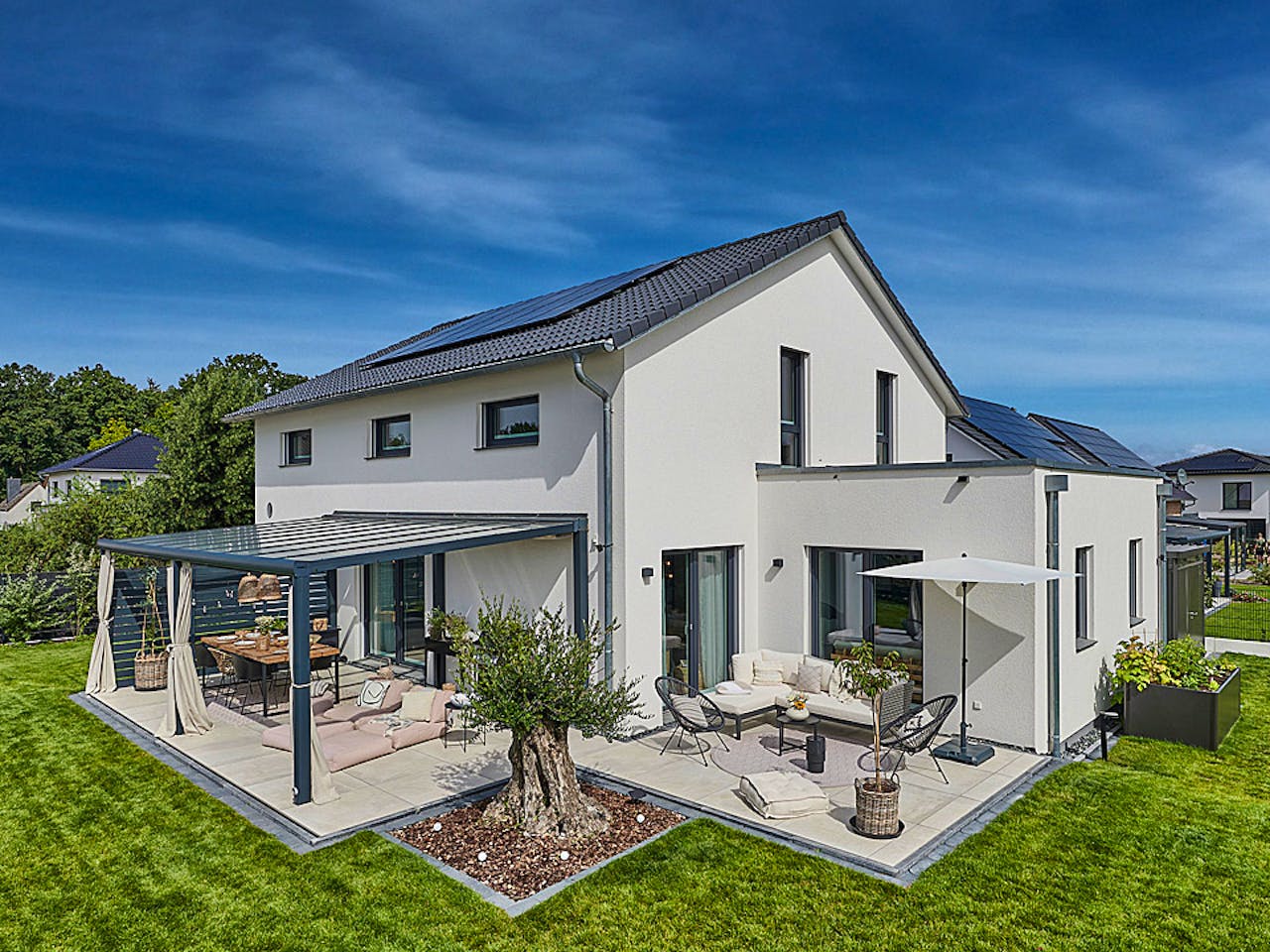 Dieser Satteldach-Klassiker besticht durch einen modernen Mix aus weißer Fassade und anthrazitfarbenen Fensterrahmen. Ein Highlight ist der Flachdach-Anbau im Erdgeschoss, der den Wohnraum deutlich erweitert. Zudem sorgt ein hoher Kniestock von 1,90 Metern dafür, dass das Obergeschoss optimal genutzt werden kann und kaum Dachschrägen den Wohnkomfort einschränken.