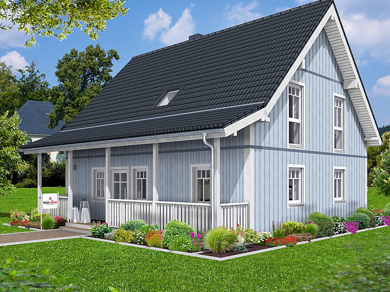Dieses Einfamilienhaus besticht durch seinen skandinavischen Landhausstil. Besonders markant sind die klassische Holzverschalung und das Satteldach mit einer Neigung von 45 Grad. Ein Highlight ist die vollständig überdachte Veranda, die dem Gebäude ein gemütliches, nordisches Flair verleiht. Wir schätzen an diesem Entwurf besonders die Kombination aus traditioneller Optik und moderner Fertighaus-Qualität.